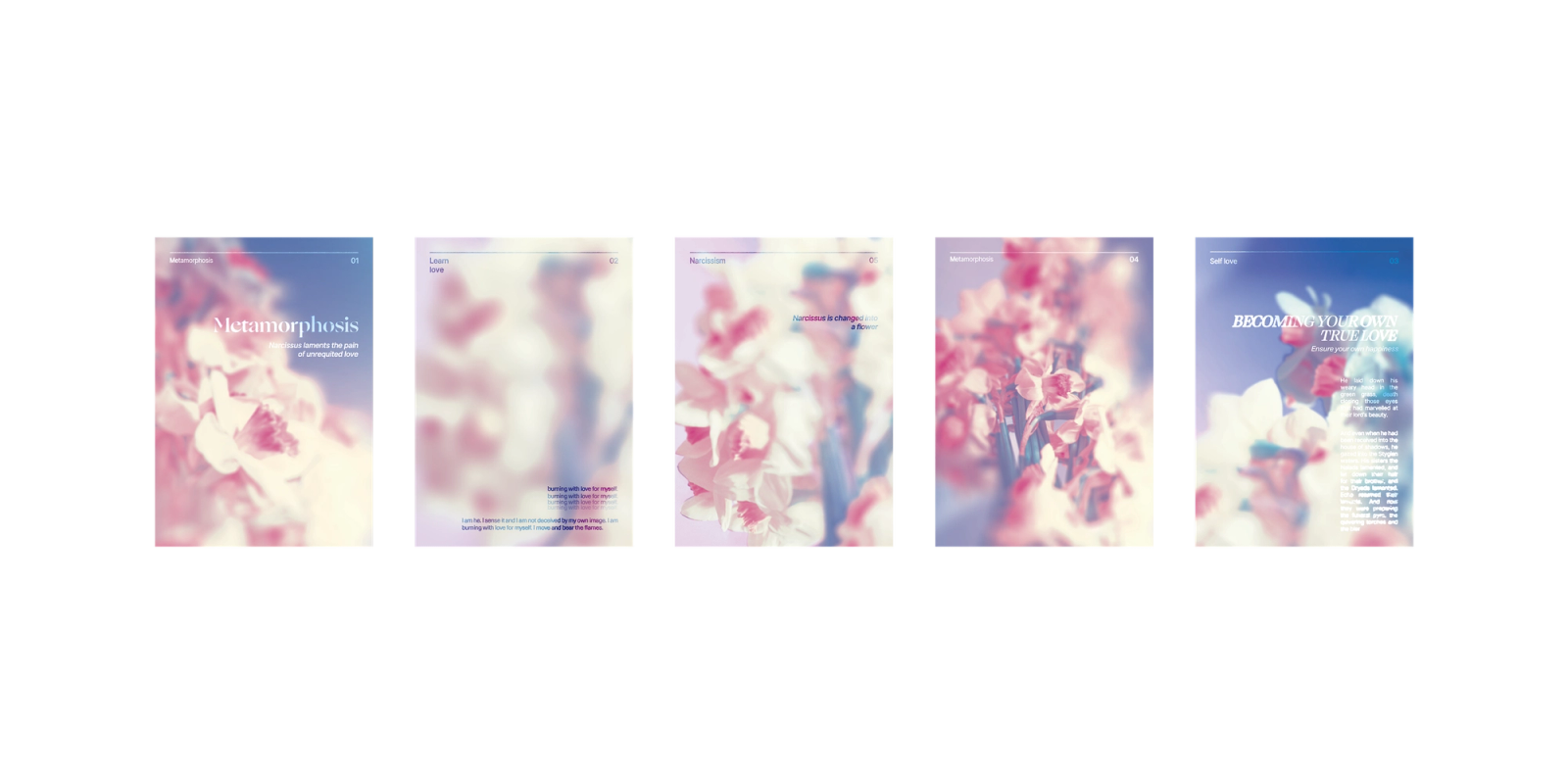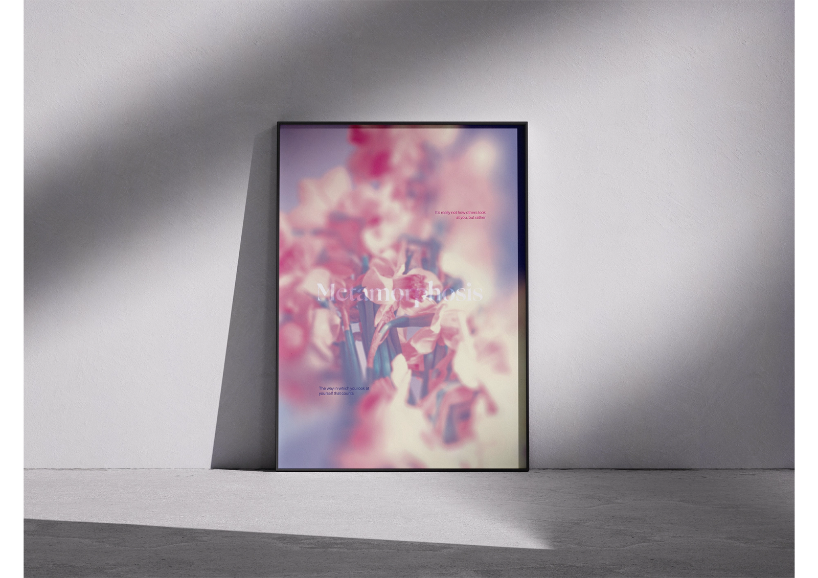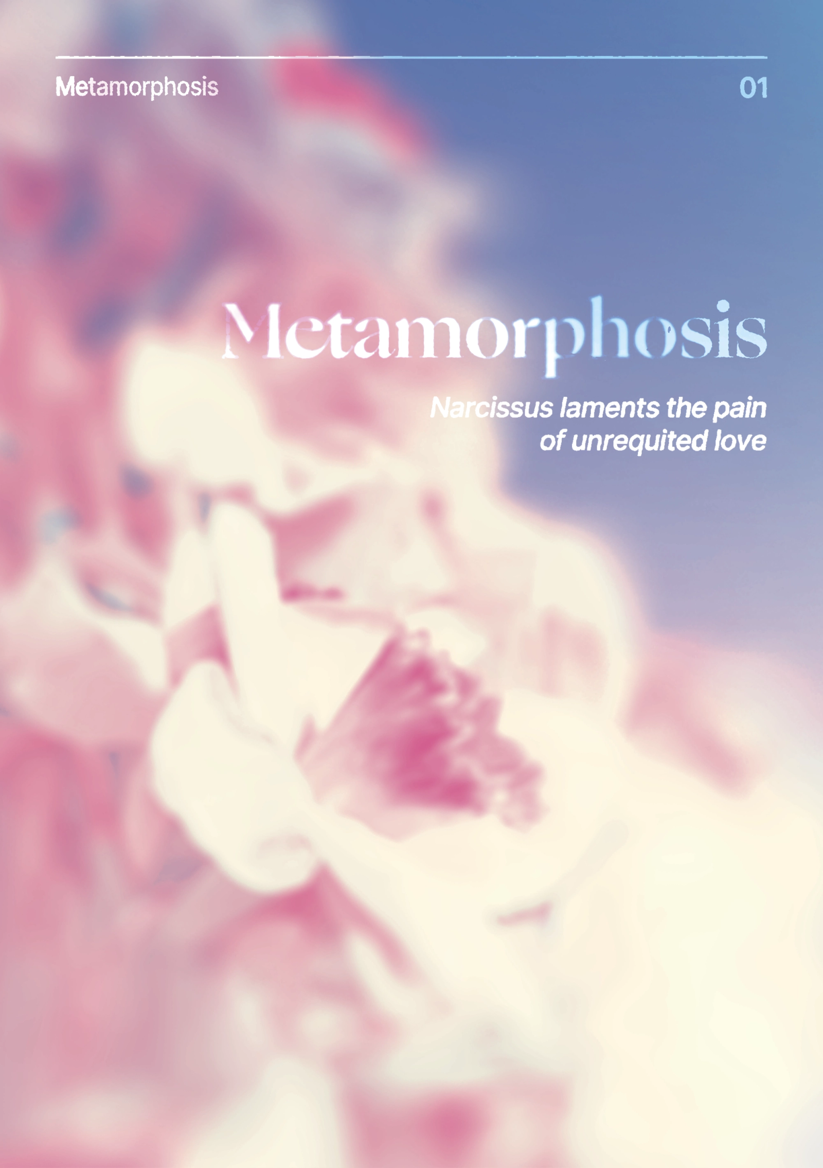 Metamorphosis is a visual reflection of the Narcissus myth, drawing inspiration from its core themes of self image. Deeply entrenched in the ethereal aesthetic of reflection, this outcome focuses on distortion of imagery in conjunction with graphic design.