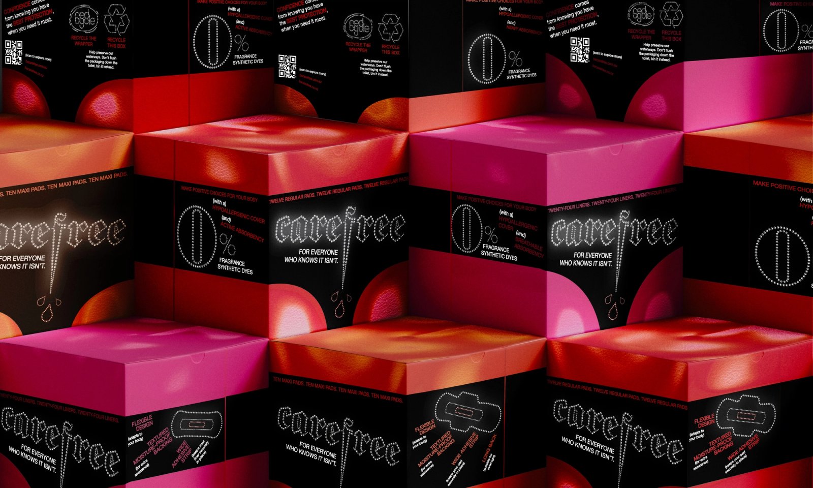 Our designs visually challenge traditional 'feminine' branding by re-packaging menstrual pads showcasing the design’s versatility and resolving the common issue of indistinguishable packaging across product types.