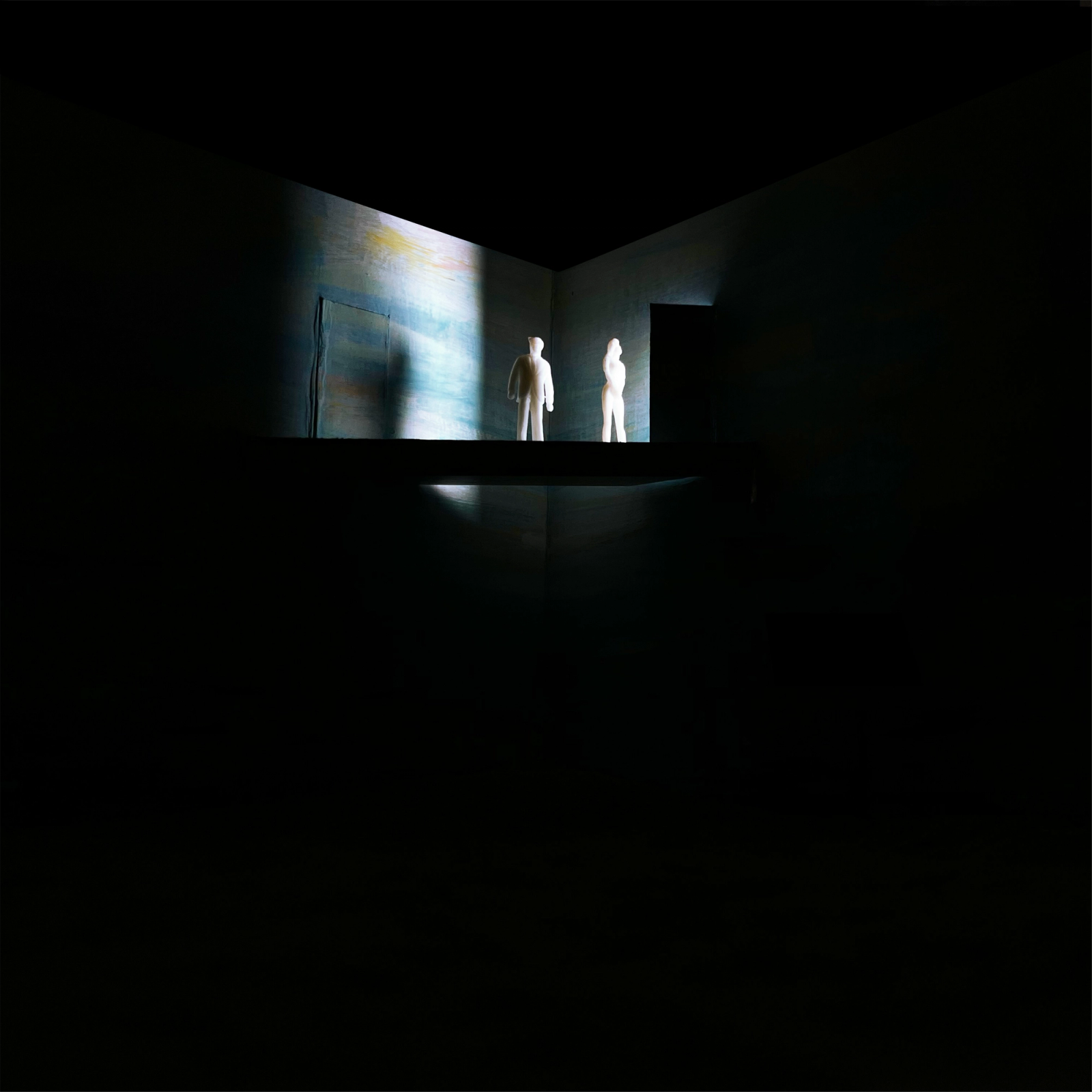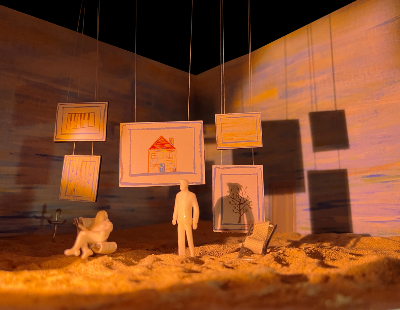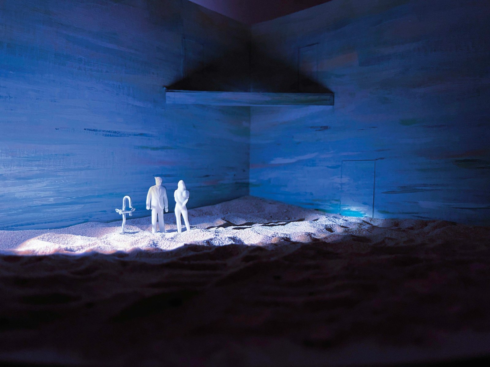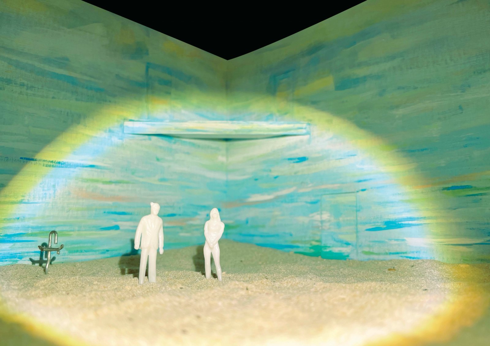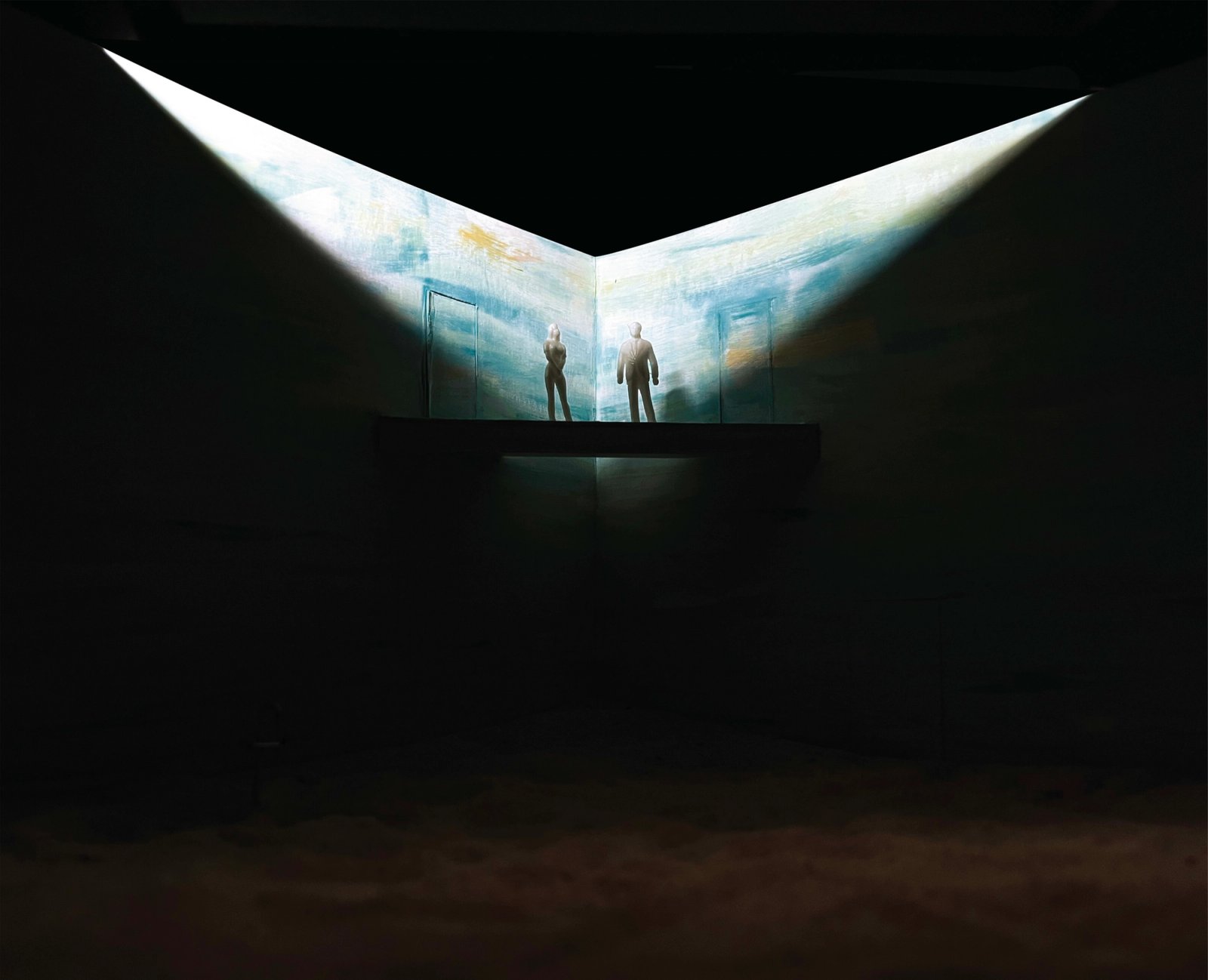 The set for Eurydice manifests as a surreal dreamscape—a painterly sky, sand, and a floating balcony form an otherworldly landscape where paternal love unlocks memory and imagination.The corner stage layout establishes a liminal space that is simultaneously defined and endless—contained yet hinting at spaces beyond view. The interplay between the familiar and uncanny evokes curiosity and magic.