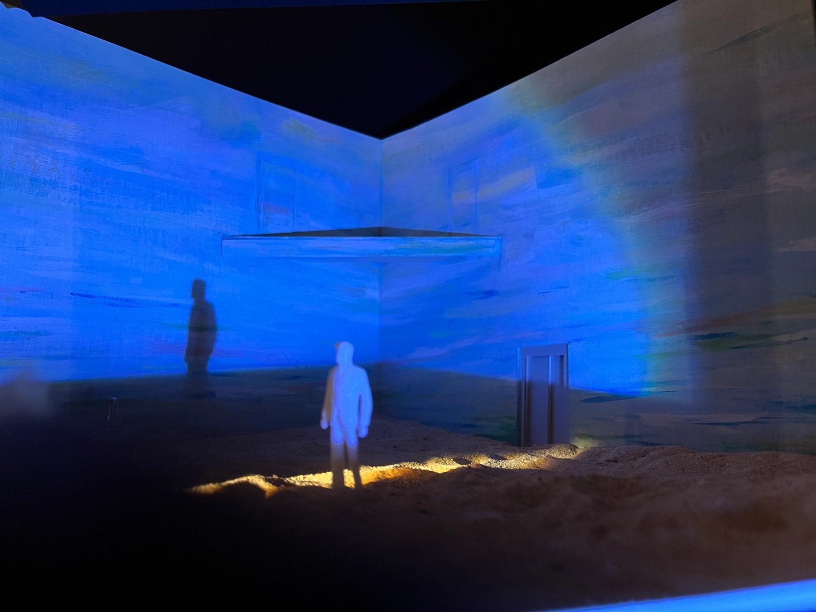 In the Underworld, the set transforms into a space of play and imagination. The Father orchestrates this shift, crafting a world of memories, nostalgia, and paternal love as hanging TV screens descend—physical manifestations of new language and shared memories. Through gesture, he cues childlike illustrations on the screens, drawing a world for her and creating a silent language that awakens their past and visualises their deepening connection.