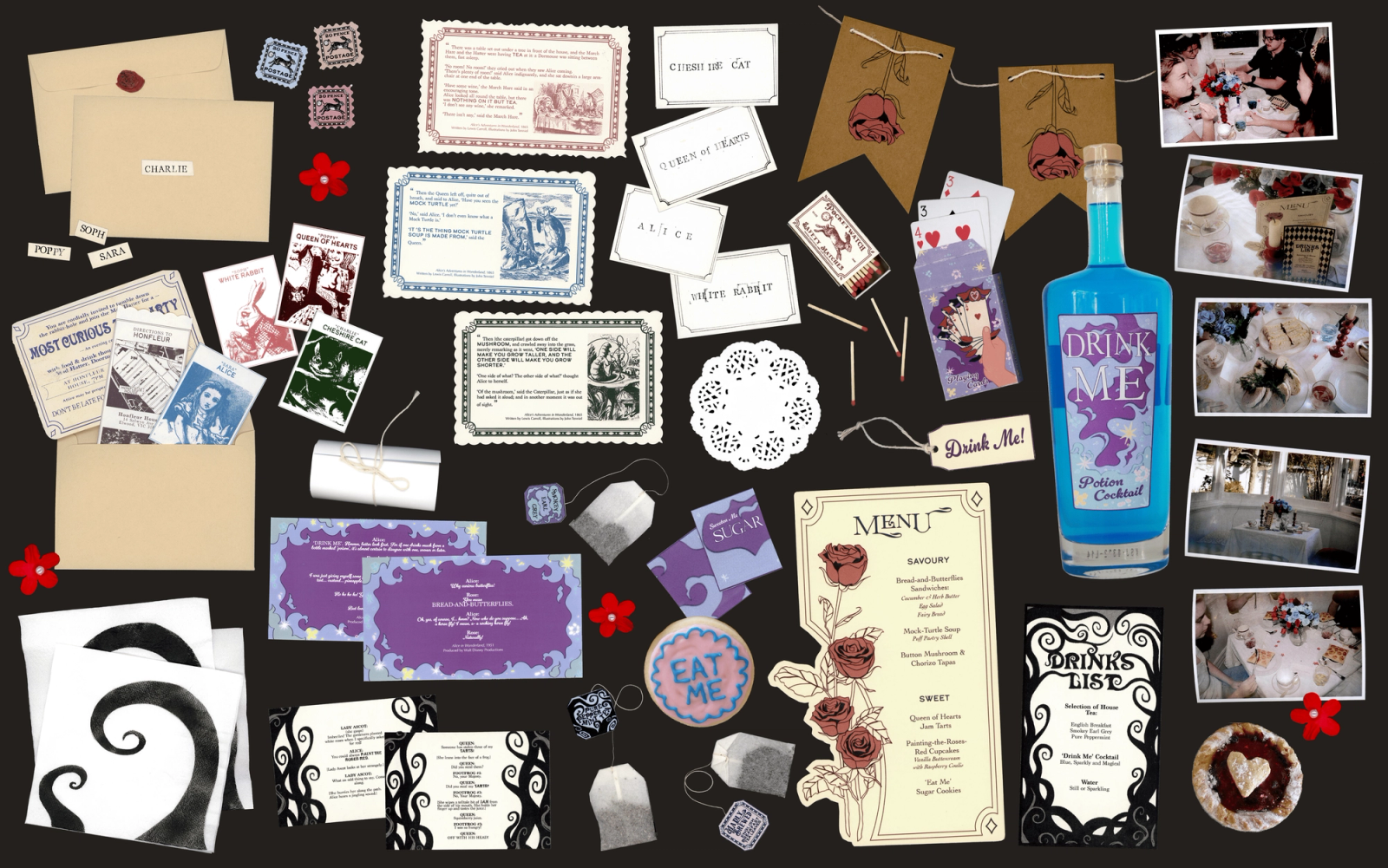 Suite of designed material for copy-of-a-copy tea party, inspired by adaptations of Lewis Carroll's 'Alices Adventures in Wonderland.'