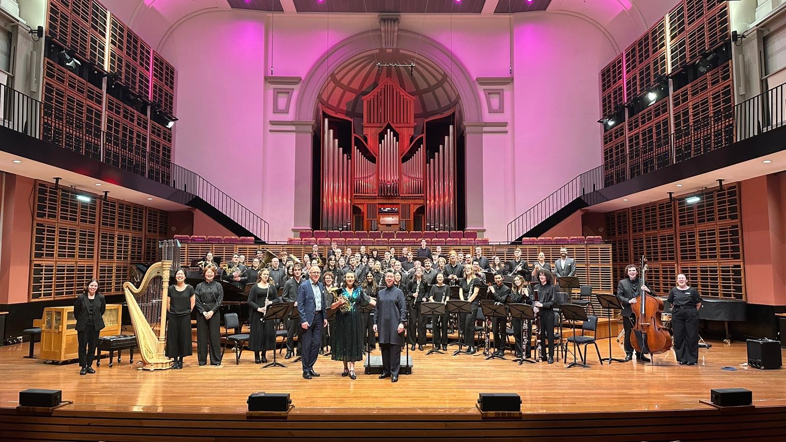 The Melbourne Conservatorium of Music Wind Symphony musicians and staff after their concert at the Sydney Conservatorium of Music. Flick was the Stage and Orchestra Management Intern on their 2025 East Coast tour.
