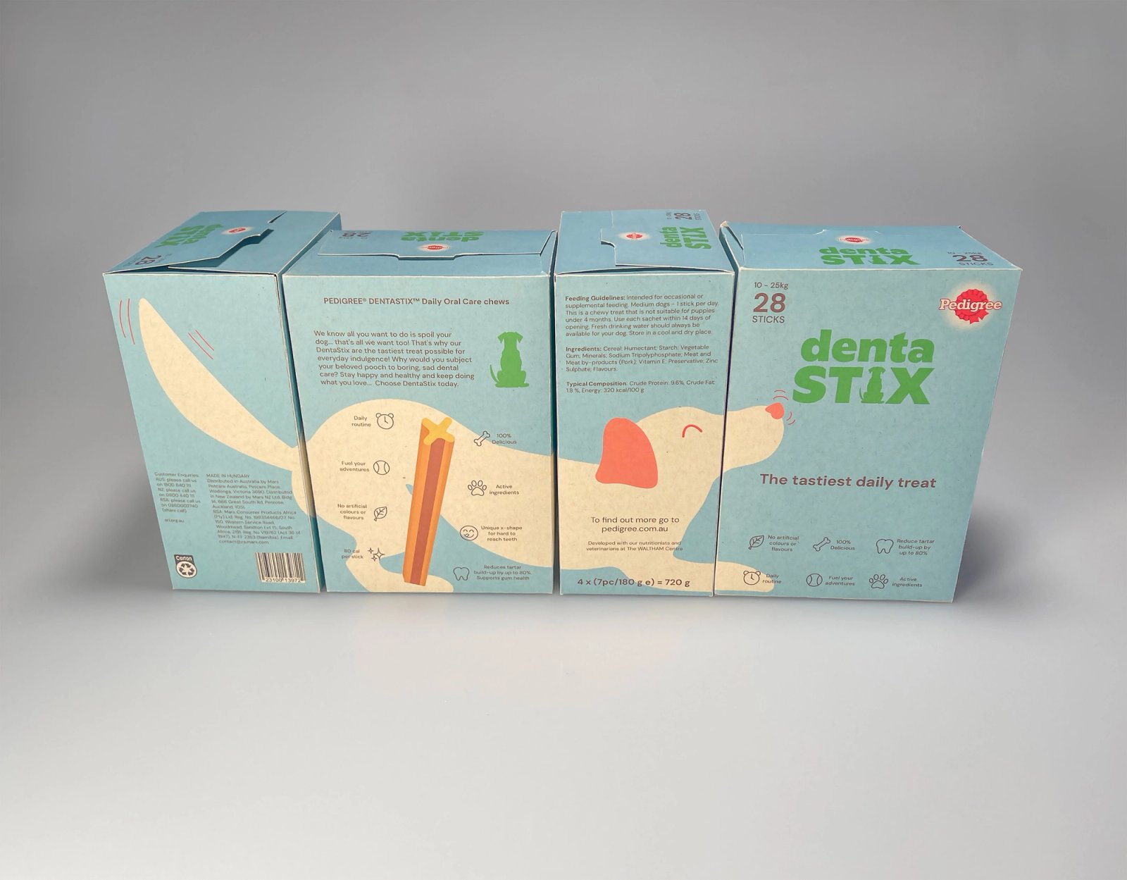 DentaStix: Consume It Rebrand (2025). "Four product packaging faces displaying visual continuity." This product design is a prototype printed onto thick craft paper. In this project our group decided to amplify the product packaging of Pedigree's sub-brand Dentastix. This product design amplification aimed to rebrand the perception of this product from being medically focused, to a more playful and healthy treat aesthetic. This design adopts a contemporary approach that works towards developing more continuity and visual expression to appeal to the targeted consumers. Its concept aims to disregard traditional approaches with static imagery of a specific dog breed, with a contemporary illustrative design creating a more dynamic visual identity.