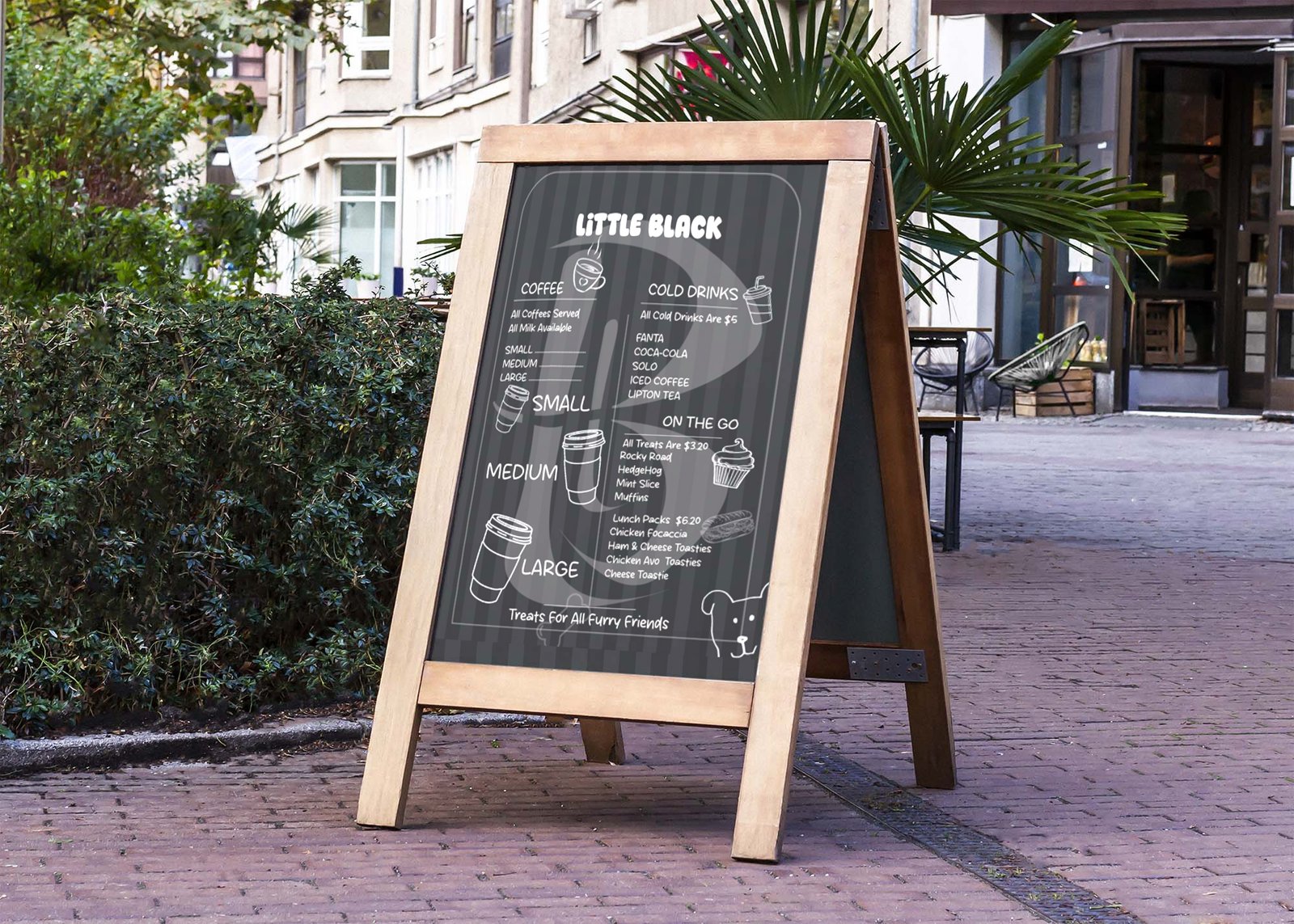 Rebranded Little Black Coffee street menu sign (2025). This sign integrates the building architecture of the corrugated container as the background of the menu design. This sign was developed to appeal to the consumers, as this coffee shop is strategically located alongside the foot path.