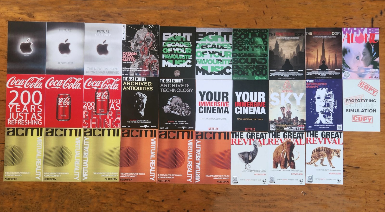 Prototyping Future Simulation: Collectable Cards (2025). A series of A5 cards, 300gsm. This project was inspired by speculative design and the projects brief of copy of a copy. The key inspiration was utilising techniques of translation and how in the past we have created translations of graphic material to sell as a different medium. This design aims to display the dynamic or static visual identities of known brands into the future, speculating future graphical content in the year 2080, through the idea of timeless copies, known as collectables, or trading cards. This project aims to challenge the idea of progression as despite the advancements in technology and design aesthetics, all projected changes are based on past trends, leaving the question are we really progressing or just reiterating the events of the past.