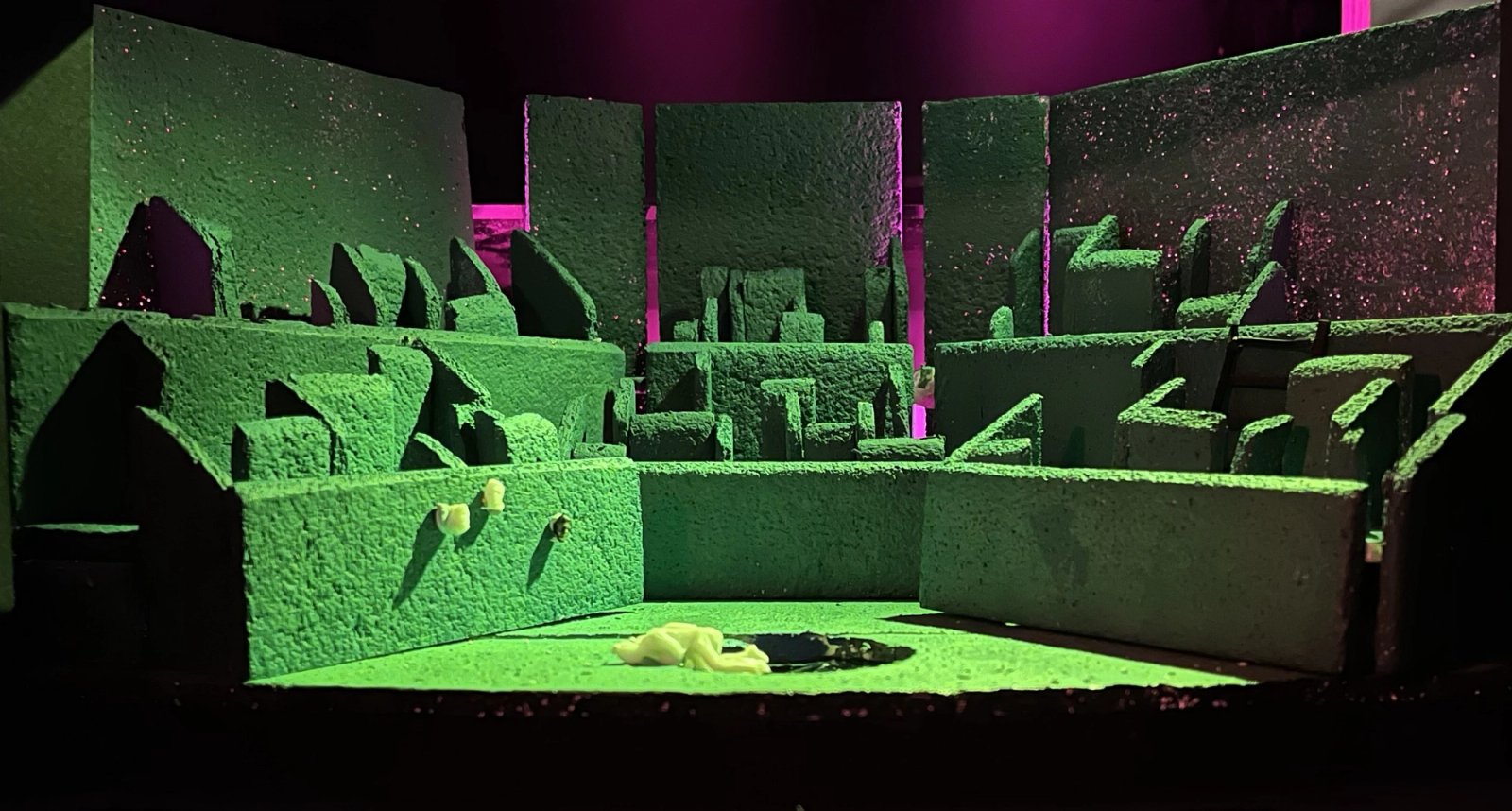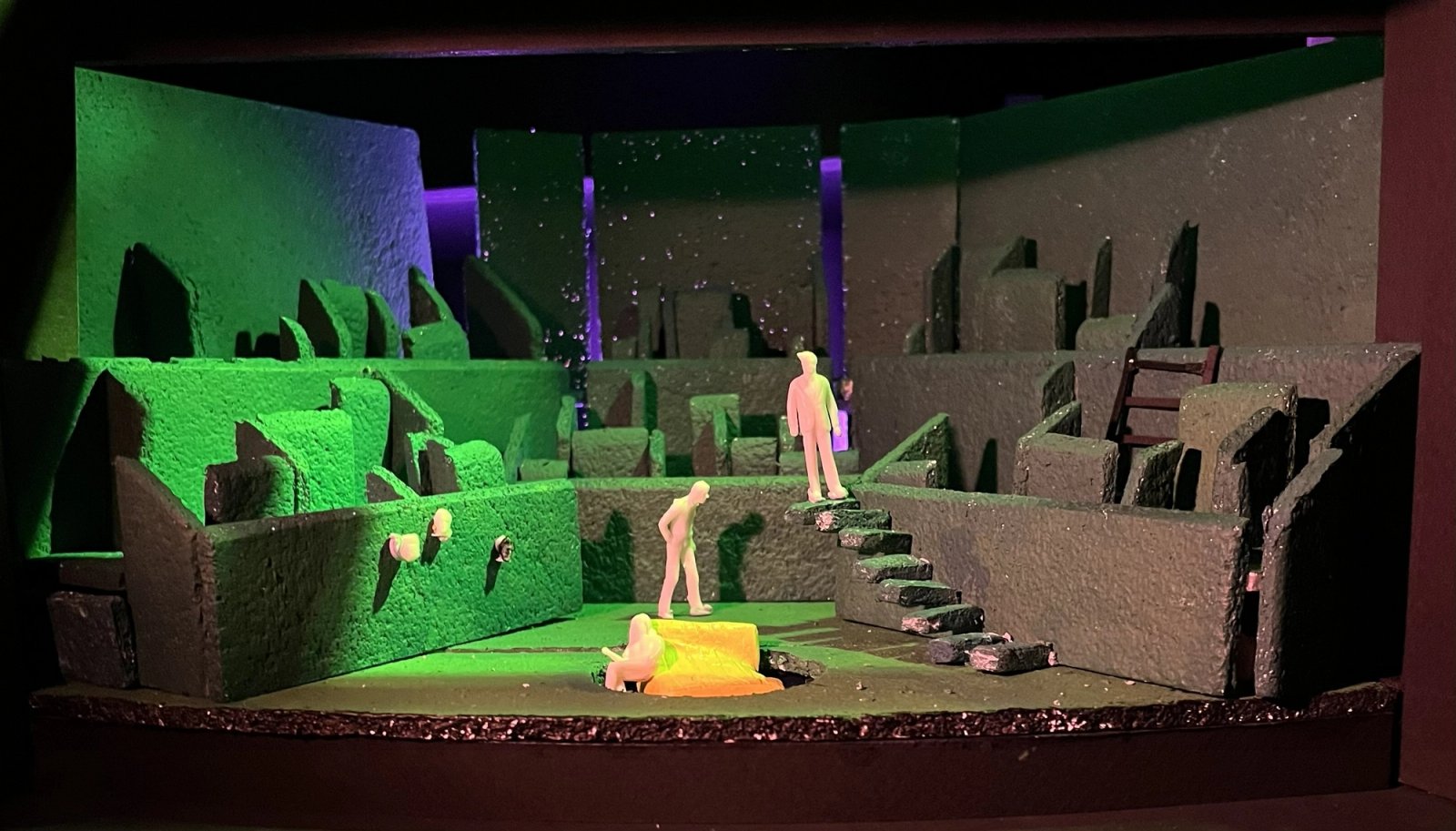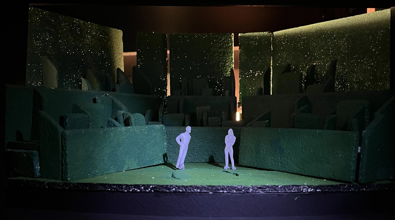 Eurydice explores the journey of retrieving love, connection, and memories - that are ultimately intrinsic to humans. The set design takes after the meandering qualities of a maze, separating characters, but also standing as a test of what a person would do for love - whether romantic, or familial. Obscured, our perception of the Underworld, the design uses the concept of a maze as a symbolism for the liminal space between life and death where the occupants struggle to navigate their ways through the world. Heightening this atmosphere of whimsicality and confusion, objects and actions appearing and disappearing through the hedge plays into depriving the audience’s sense of directions and order. My design positions the audience to be complicit in this journey of navigating through the maze through manipulation of perspectives, allowing the audience to peer into the complicated relationships of humans.