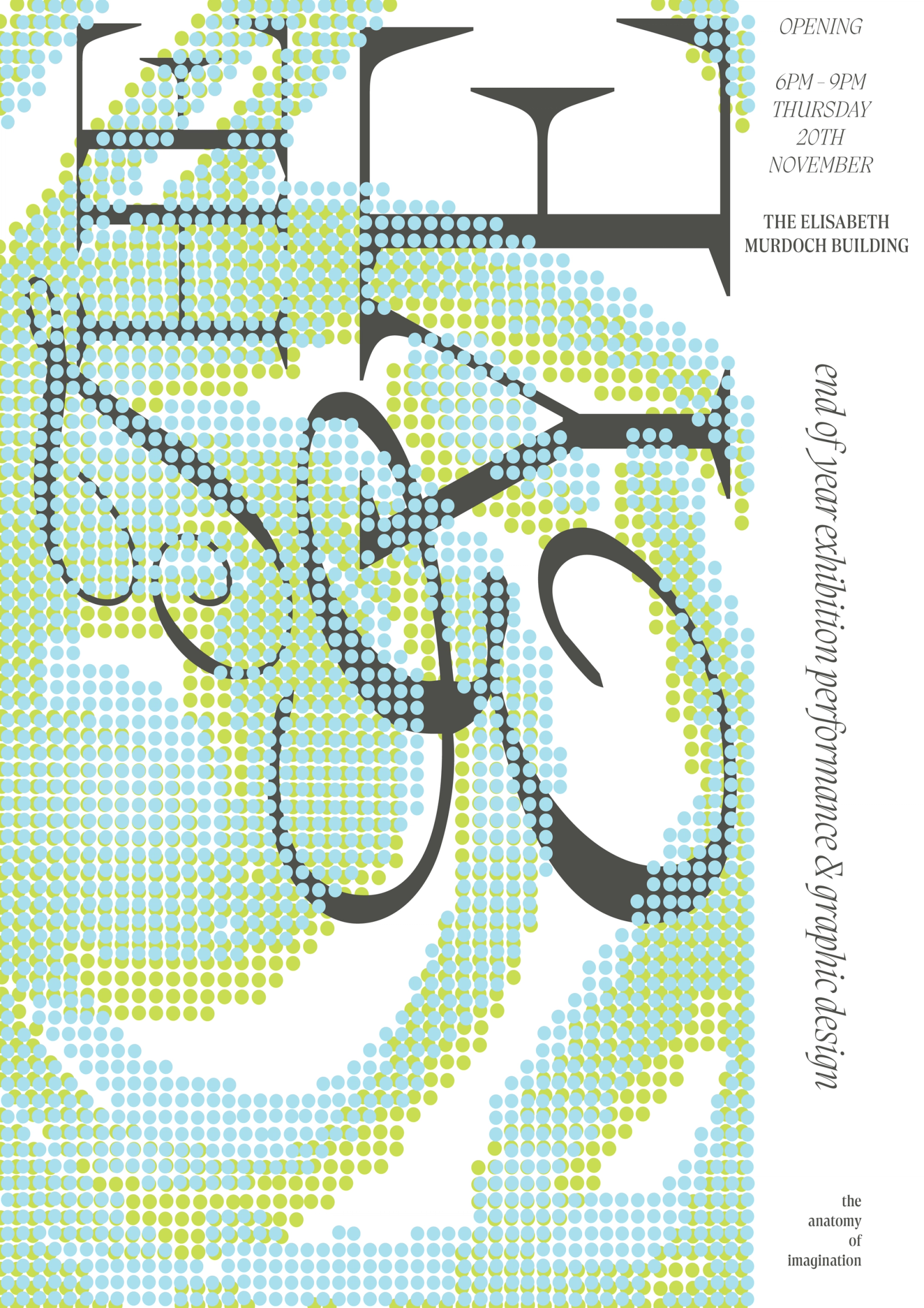 Our visual identity for the End of Year Exhibition (EYE) reflects the intersection of graphic and performance design, celebrating the innovative, contemporary approaches that define the next generation of designers. We aim to juxtapose the ‘whimsy’ of the performance design discipline with the bold rigidity of graphic design.