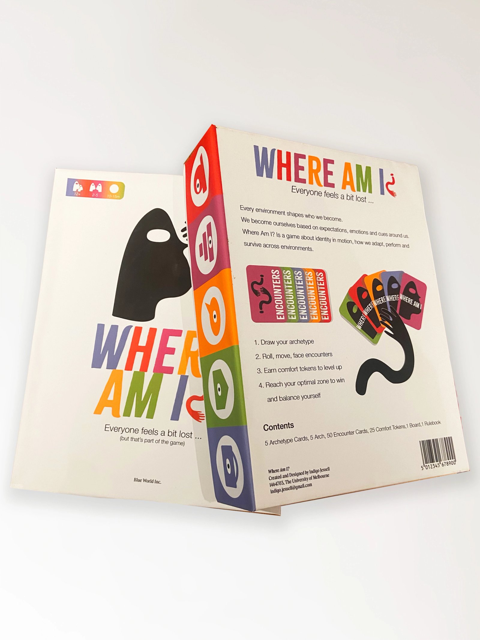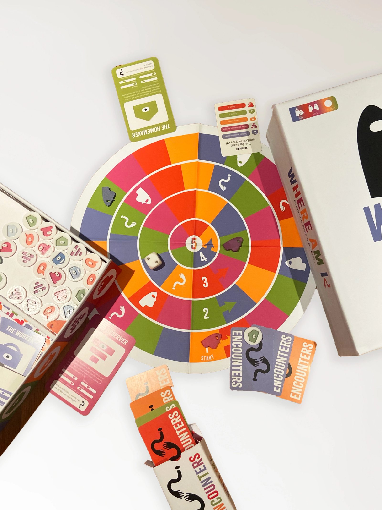 Where Am I? Is a board game that dives into the theory of identity, and how we are divided into different versions of ourselves based on our environments. The aim of the game is to understand our reactions and comfort zones based on the external environment.
