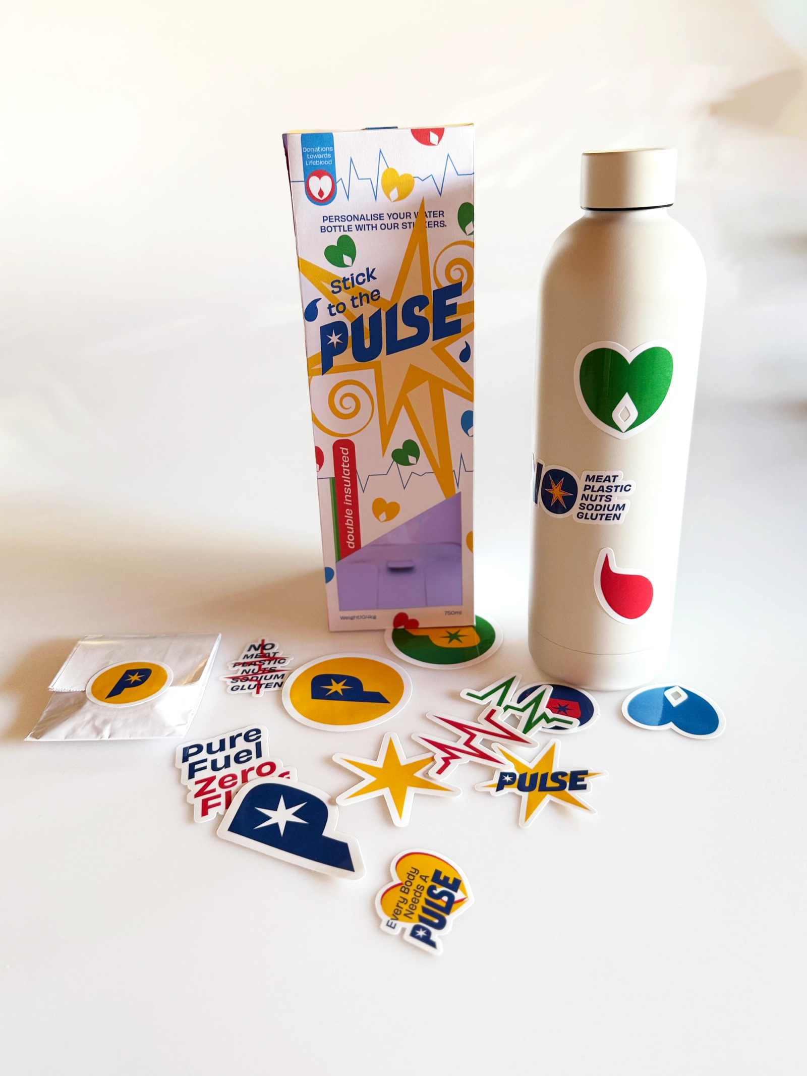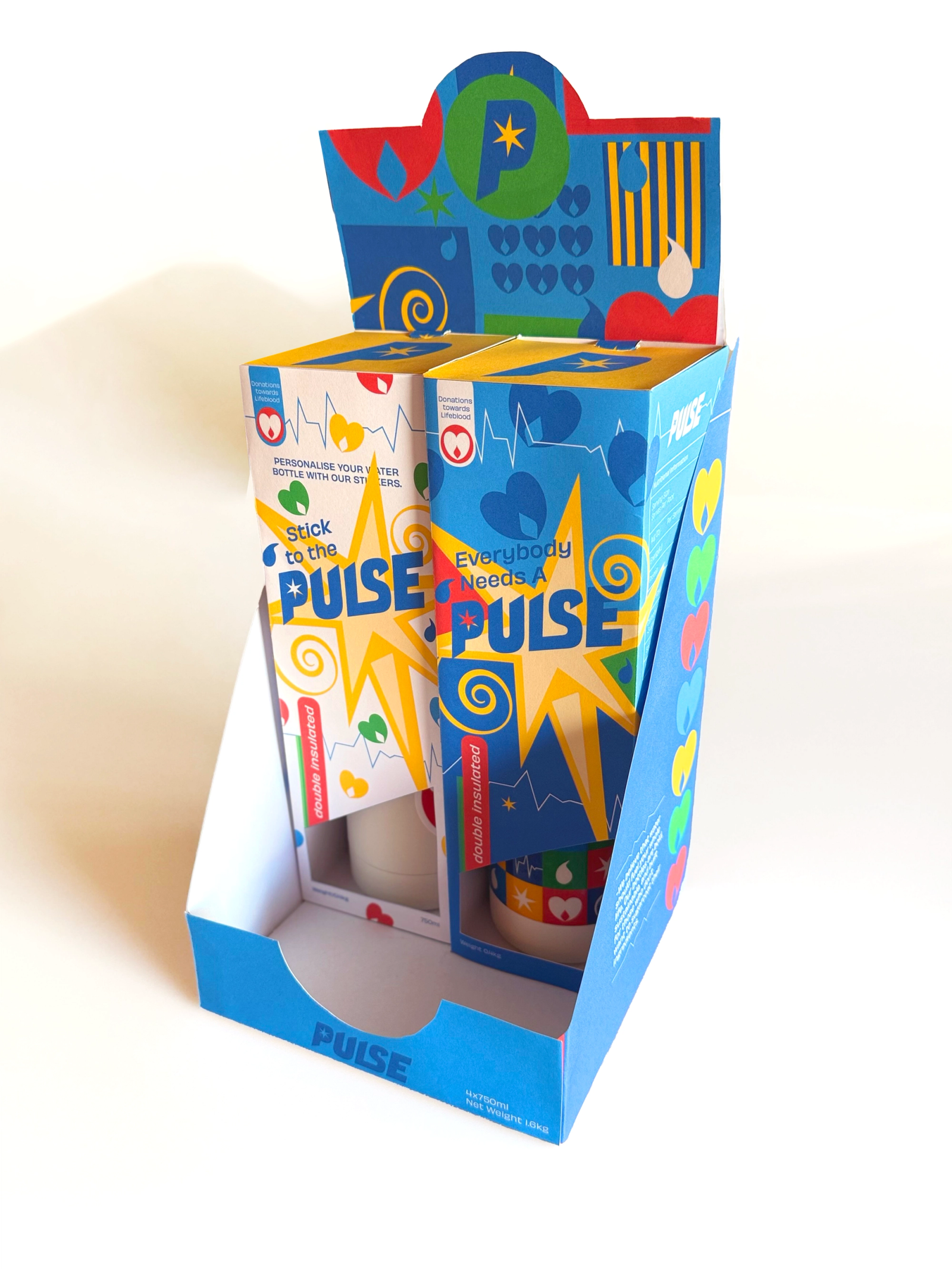 Pulse is a group project with Eloise and Jamie, exploring the satirical application of marketing for a new water bottle brand. Using primary colours and comic inspired graphics, this explosive design supports the message of the brand, subverting the unhealthy food market with our humorous system towards the ingredients of water.