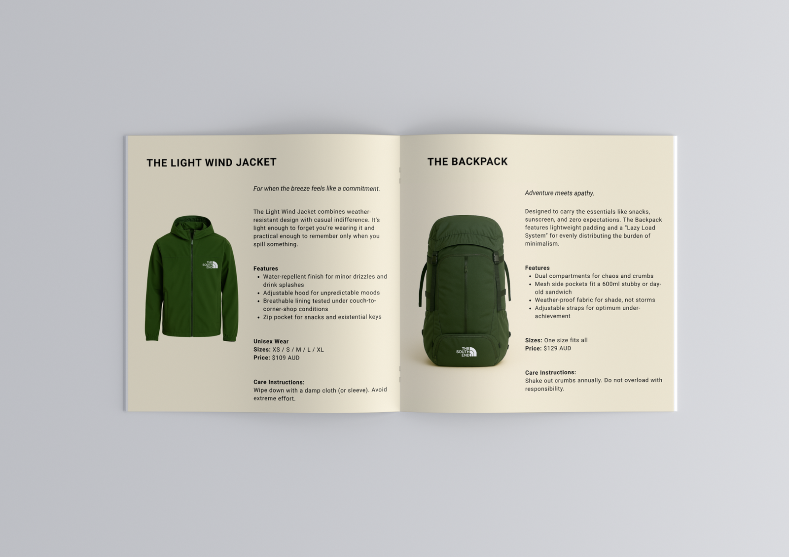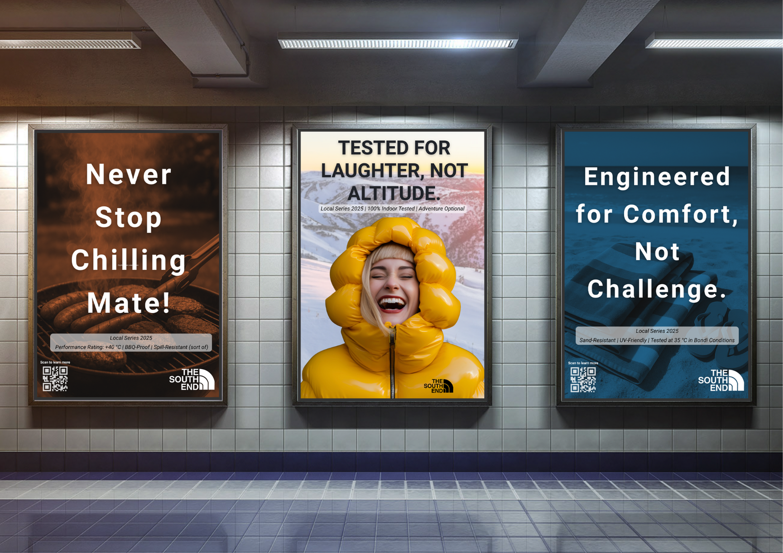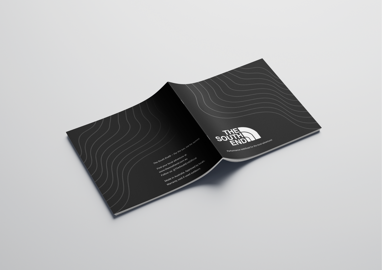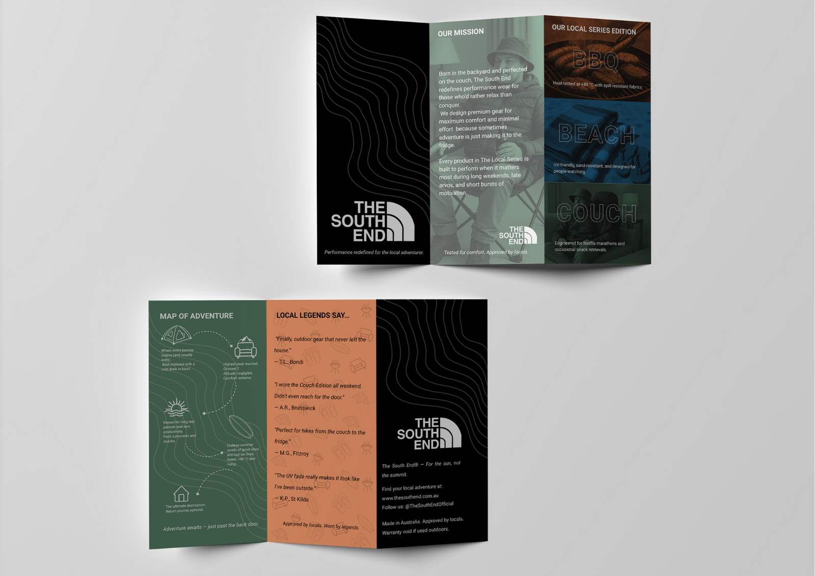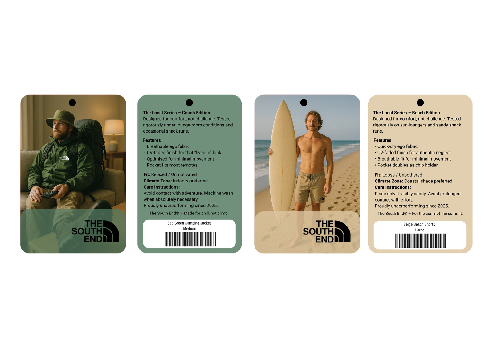 Her graduate project, The South End, is a satirical outdoor-lifestyle brand that playfully redefines “performance wear” for the deeply relaxed. Through posters, packaging, a catalogue, swing tags, and a tri-fold brochure, the project subverts the aesthetics of global outdoor brands to explore the idea of copying as a generative act. Blending human-led design with AI-assisted image making, Ishita examines how authenticity is constructed and how easily it can be imitated.