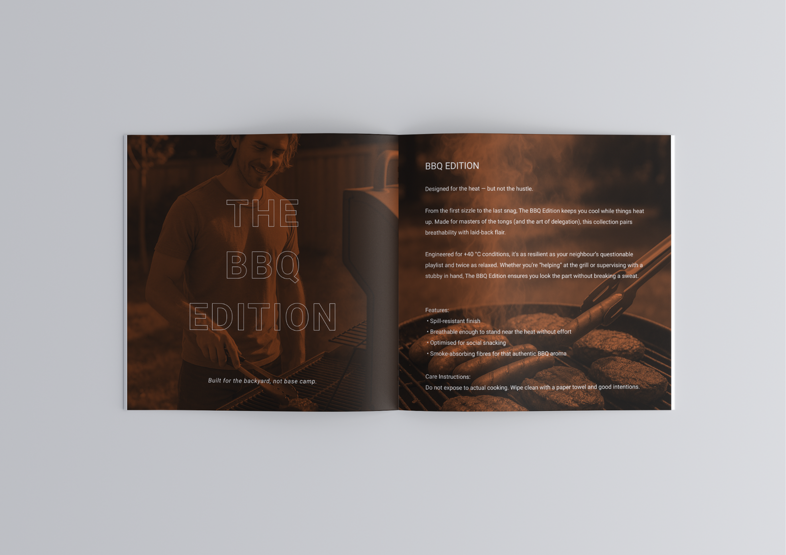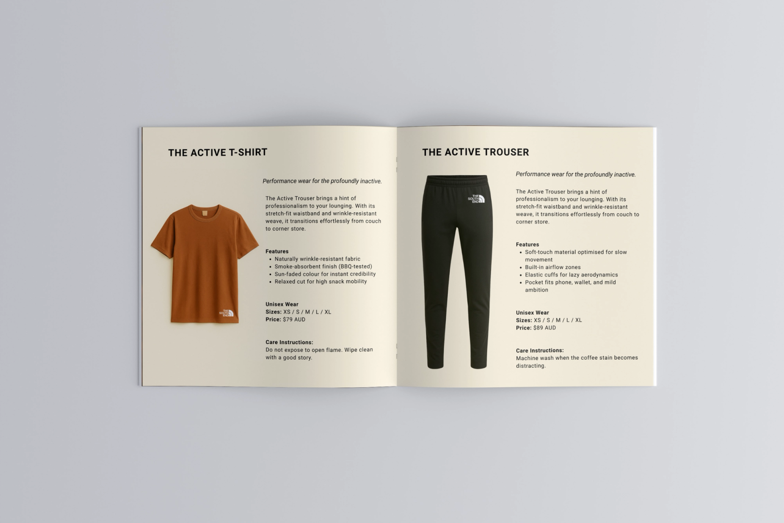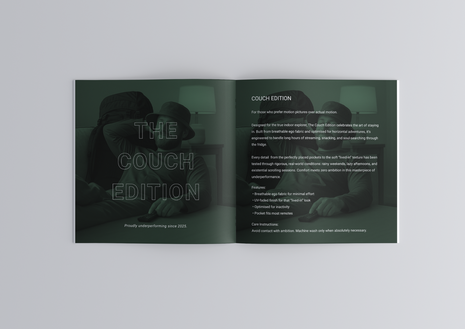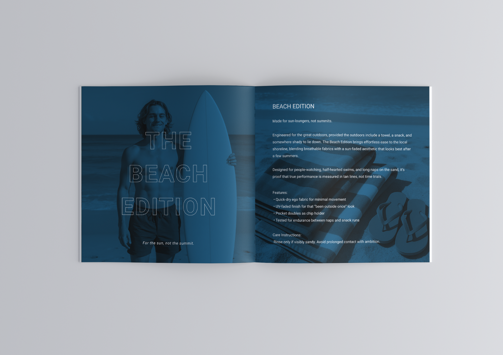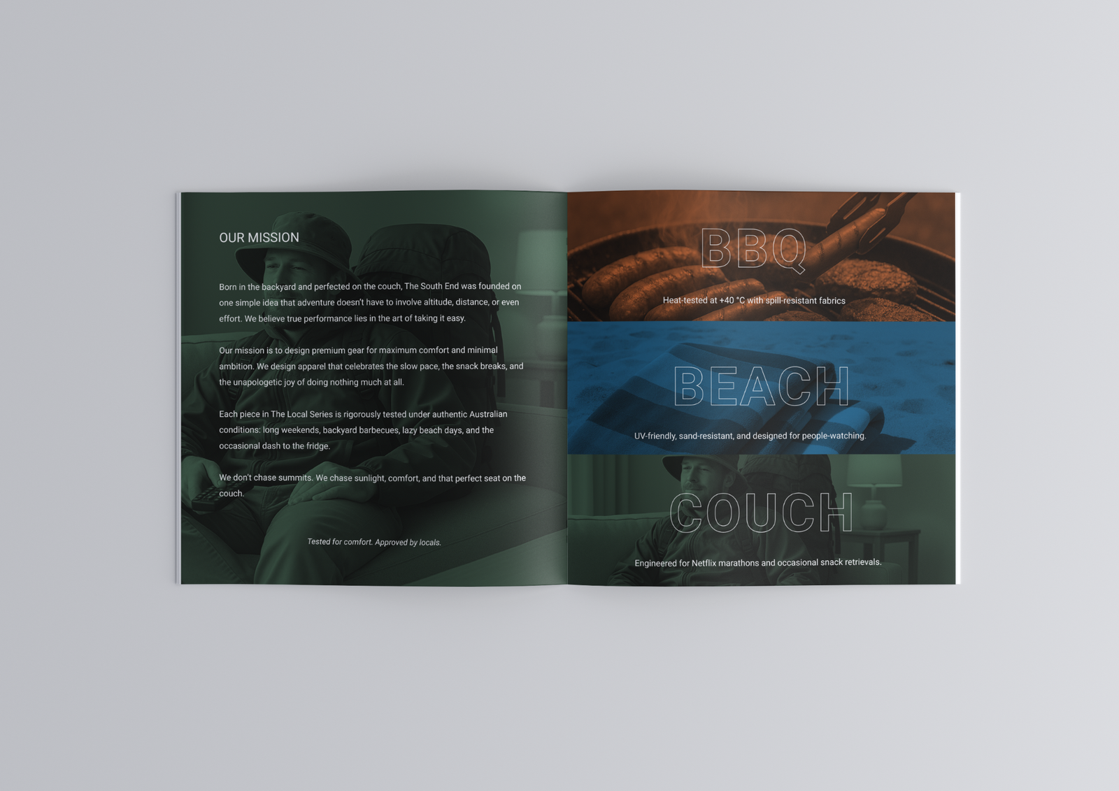 Her graduate project, The South End, is a satirical outdoor-lifestyle brand that playfully redefines “performance wear” for the deeply relaxed. Through posters, packaging, a catalogue, swing tags, and a tri-fold brochure, the project subverts the aesthetics of global outdoor brands to explore the idea of copying as a generative act. Blending human-led design with AI-assisted image making, Ishita examines how authenticity is constructed and how easily it can be imitated.