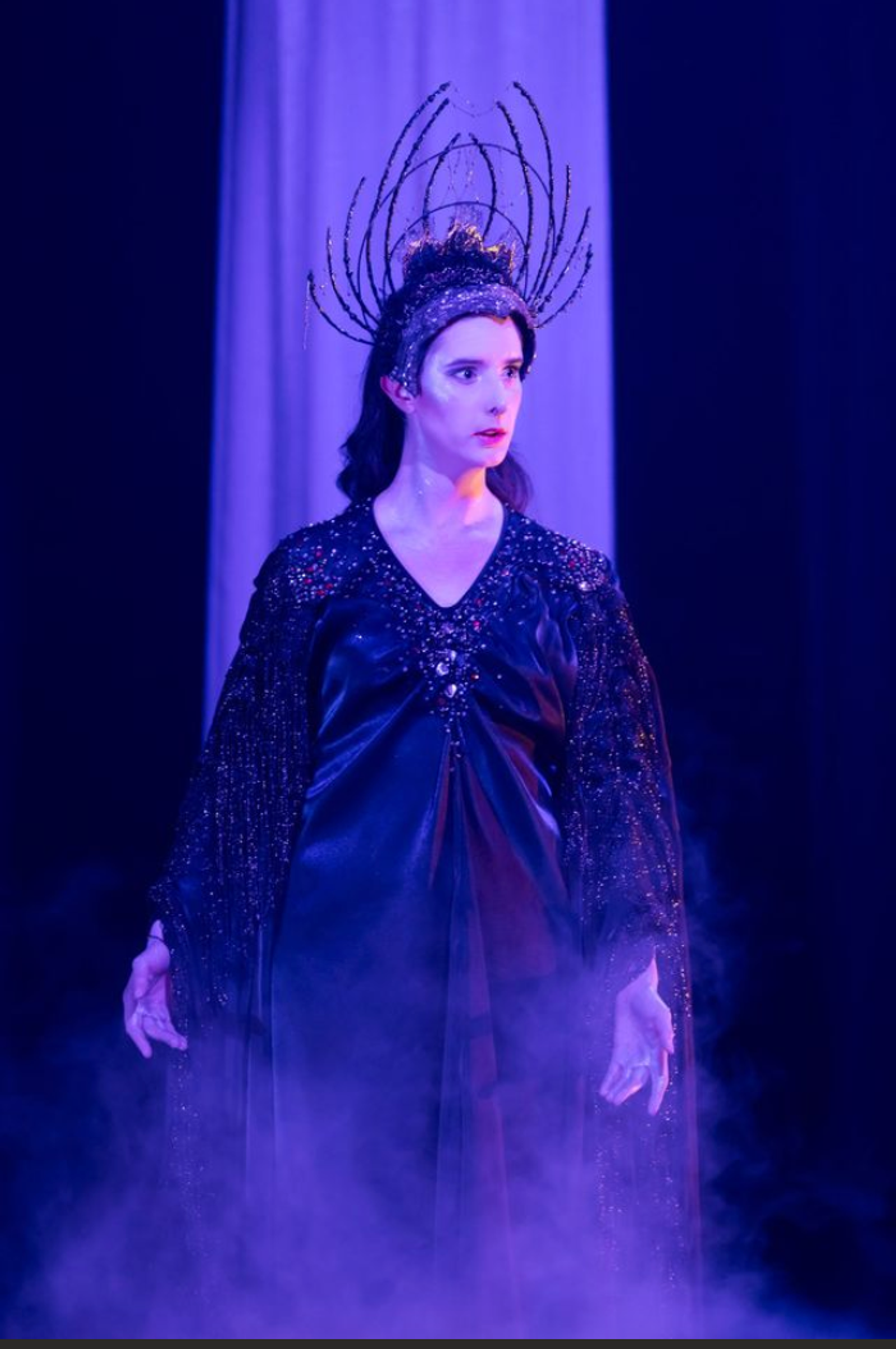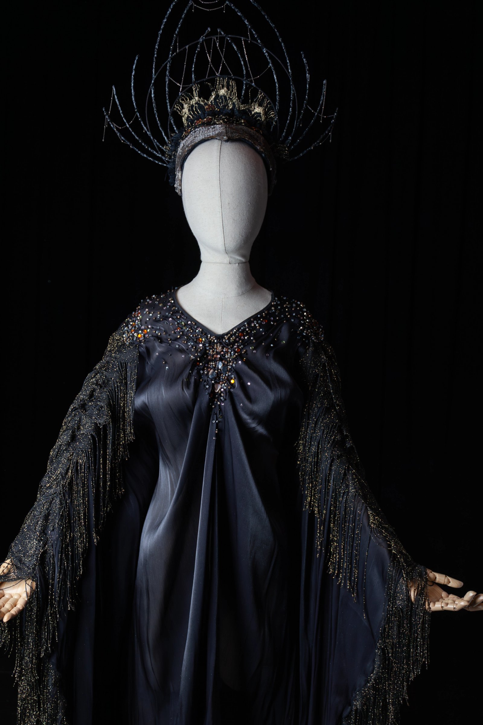 The Coronation of Poppea, 2025, featured the presence of four goddesses. This costume is from the character of Pallade, the Roman equivalent of Athena. In the opera she appears to tell Seneca, emperor Nerone's tutor and advisor, that his impending doom is upon him. This character only appears briefly but there was an emphasis on making sure she was just as celestial in looks to the other goddesses. Unlike the rest of the goddesses, who were dressed in light beiges and adored with pearls, Pallade differs in that she greatly contrasts their designs in both colour and silhouette. Whereas La Fortuna, La Virtu and Amore are based on the water, Pallade's design was based on the earth to show she predates and comes from something more ancient. The piece is a long poncho made from a black crystal organza. The chest and shoulders were hand-sewn with beads and the arms were embellished with a metallic gold laced fringe. The headpiece was made mostly from millinery wire covered in hot glue to give texture and painted black with gunmetal silver dry-brushed on top. Further details were cut from lace and beaded fabric to framed the head.