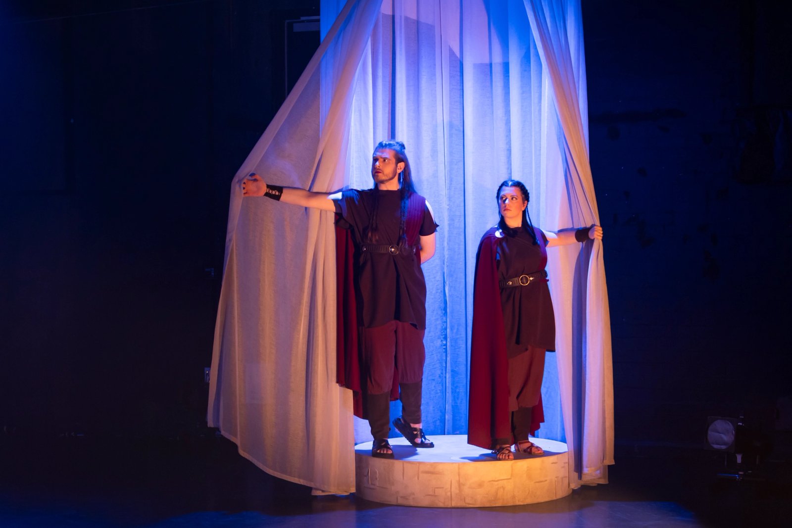The Coronation of Poppea, 2025, depicting two soldiers that within the narrative are under emperor Nerone's command. They wear blue Roman style tunics with a crimson red cape draped over their shoulders. Jamie constructed these pieces which were of a similar silhouette to emperor Nerone as a reflection of his influence. Although they are not as ornate as Nerone's as a reflection of their lower status in comparison.
