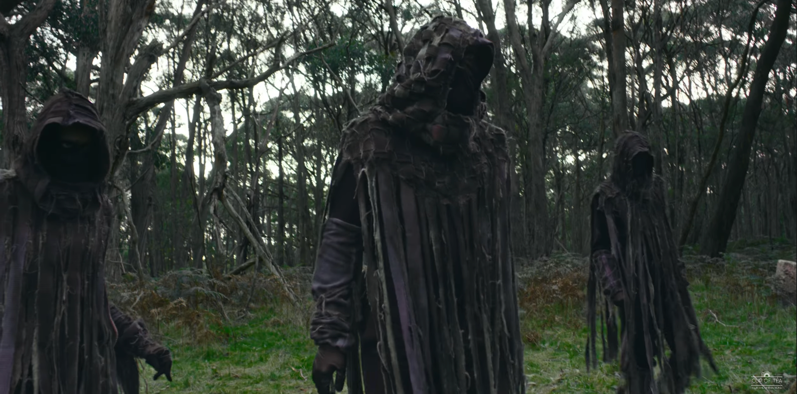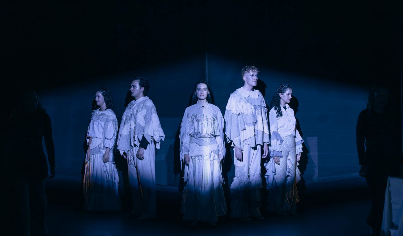 Jamie was the costume designer and head of wardrobe for Tales of the Hunted, 2023. They were tasked with designing for a creature that was described as a 'shadow creature' who were guardians of the forest. Inspiration came from depictions of fungi, decay and raggedness. A key inspiration was the 'Dark Master' from Bridge to Terabithia, 2007, as it chases after Josh Hutcherson's character through the forest in the same ragged drapery. These character were designed to have these detailed overlayers but the underlayers were plain blacks to receed the rest of the performers silhouettes in shadow and convey a sense of incorporeal form.