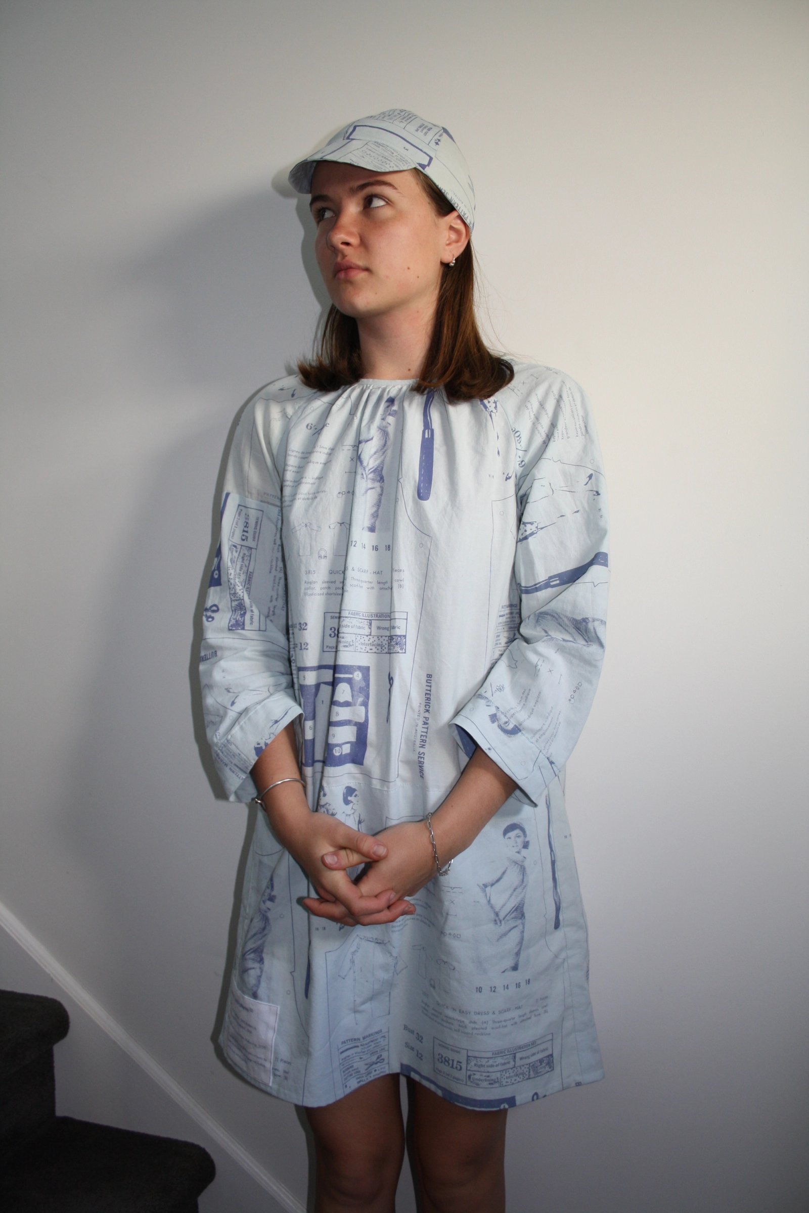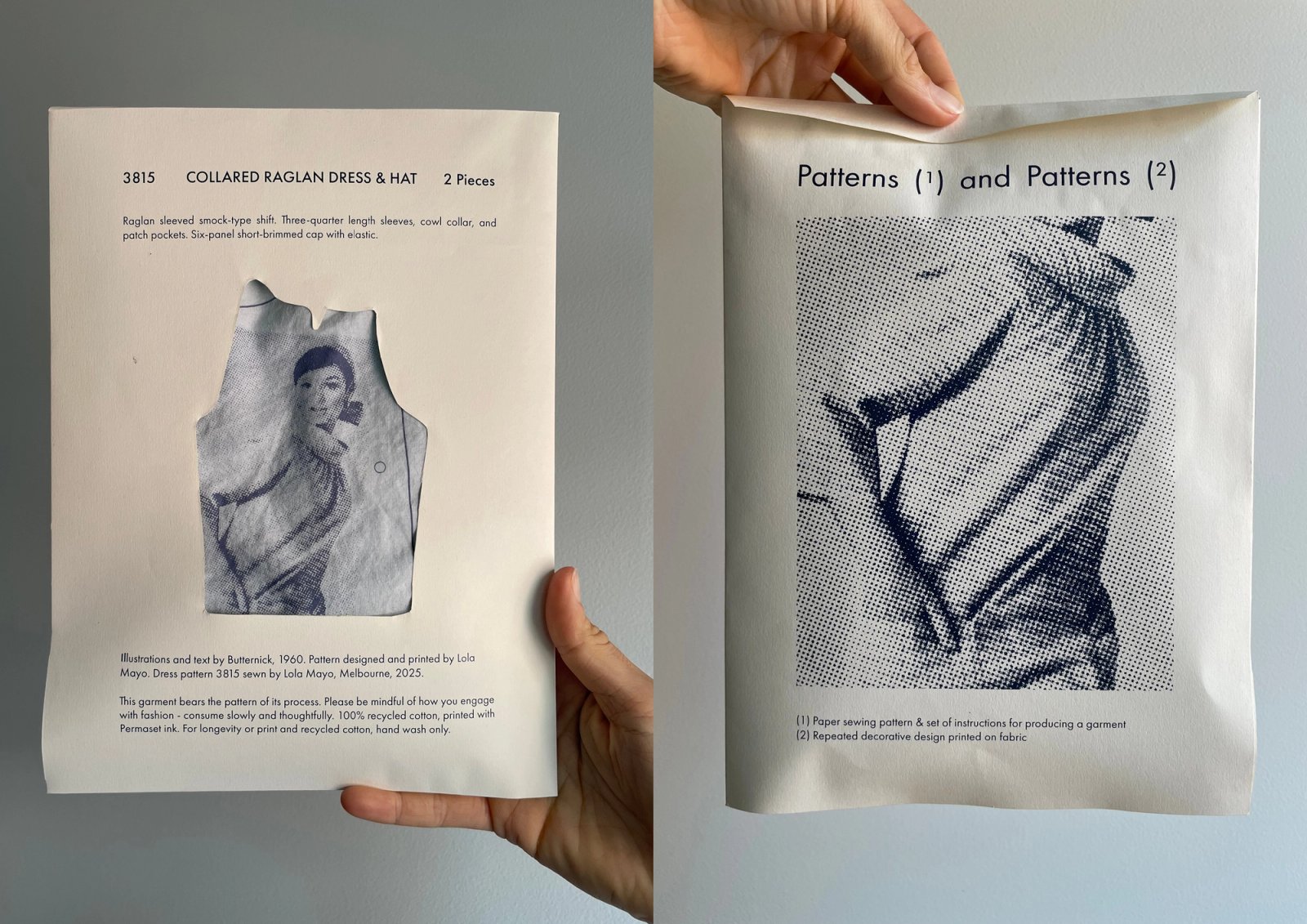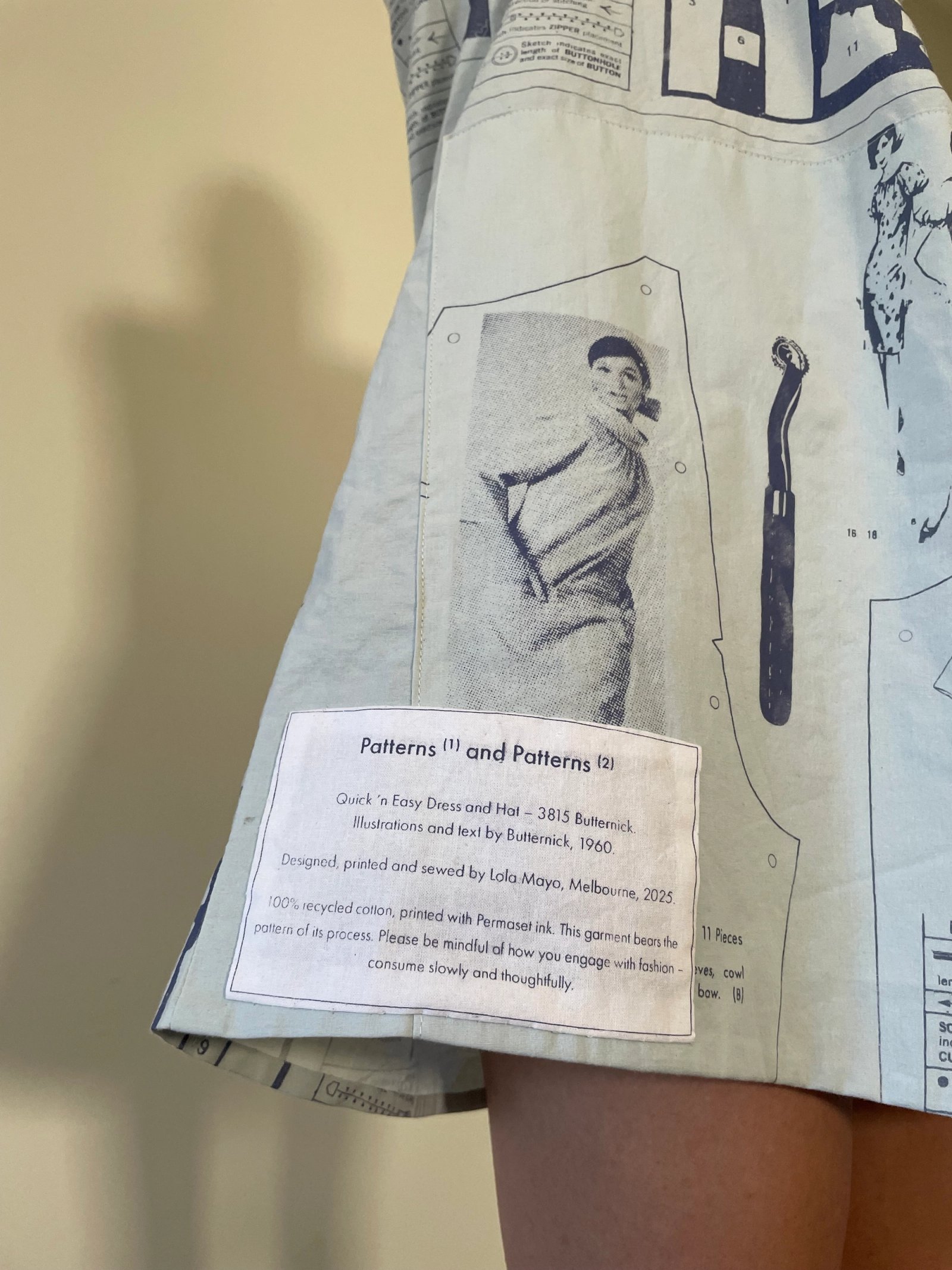 Reproducing a vintage home sewing pattern as a decorative fabric print reveals the painstaking process of producing a single garment. This garment bears the technical and considered pattern of its process, encouraging wearers and viewers to reflect on how they engage with fashion, and inspiring more thoughtful consumption.