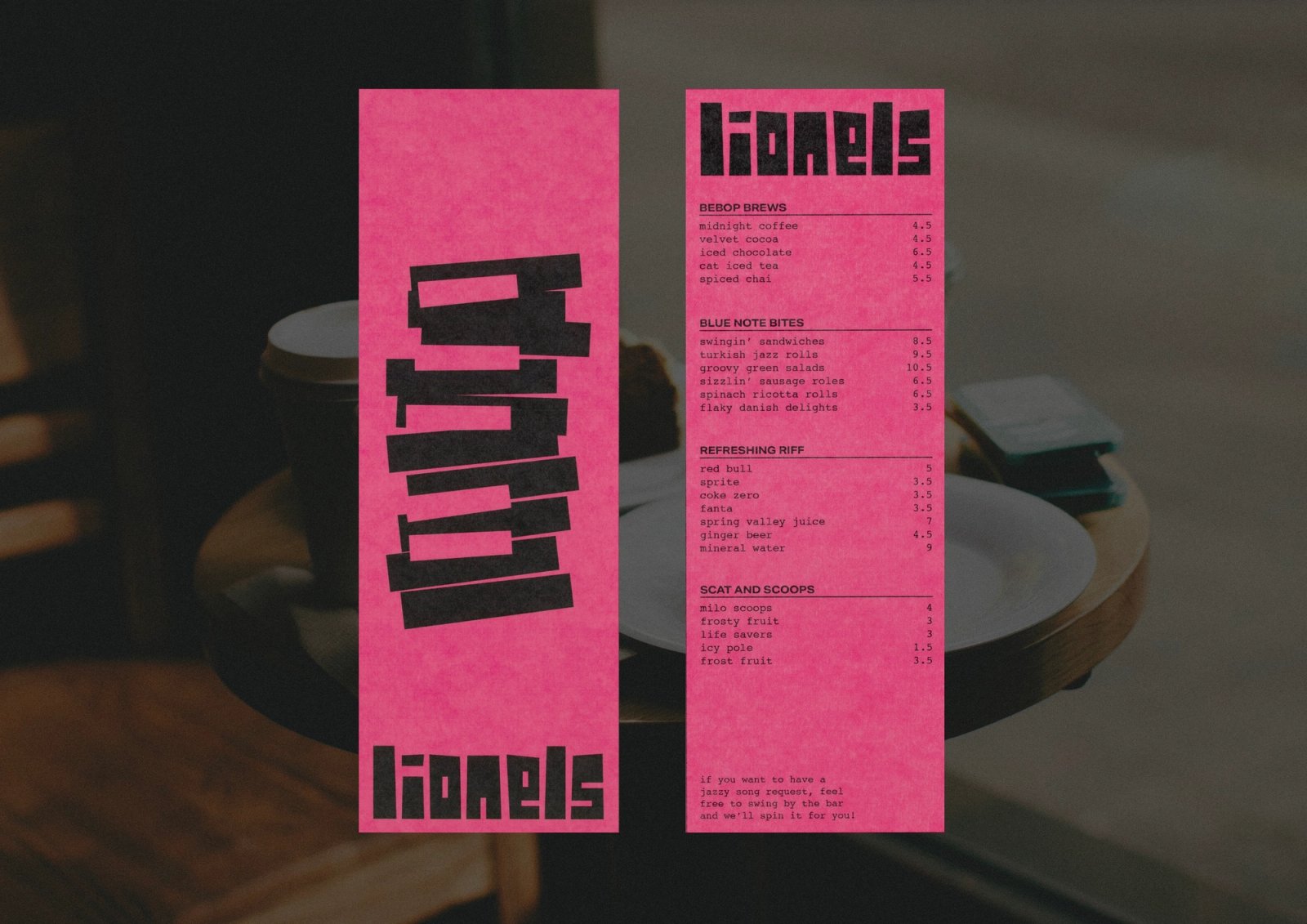 Lionel's cafe menu, paper, 2025. Rebrand of Lionel’s Cafe situated in the Southbank campus. This is a menu of the new visual design of Lionel's cafe, portraying a more jazzy and contemporary style than their current design.
