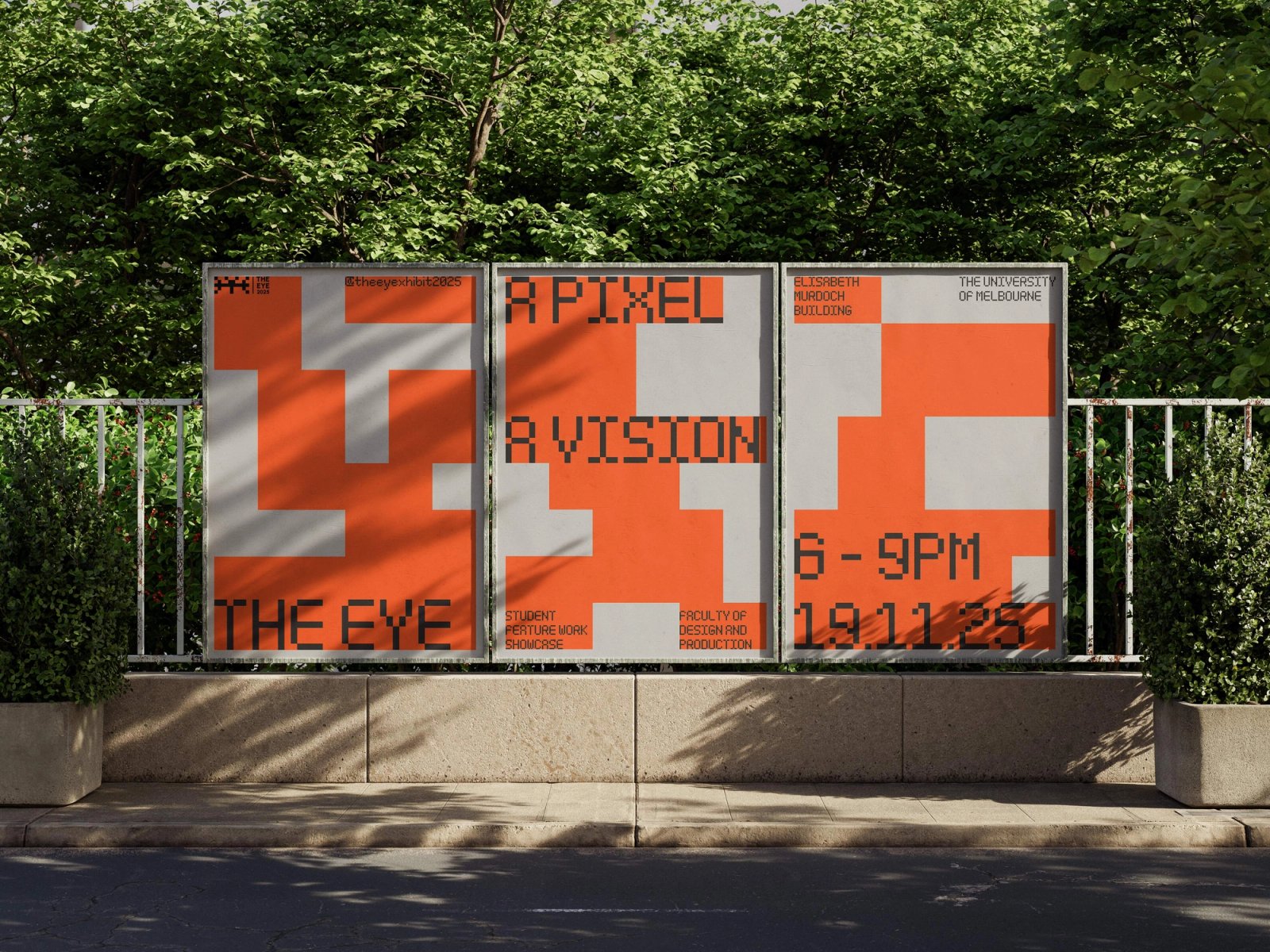 A1 poster series, 2025. postersThe EYE Posters made for the End Of Year Exhibition Identity. Concept: Just as pixels form the foundation of digital displays, every discipline in the School of Design works with its own ‘pixels,’ the smallest building blocks of creativity. In graphic design, they are digital units; in performance and