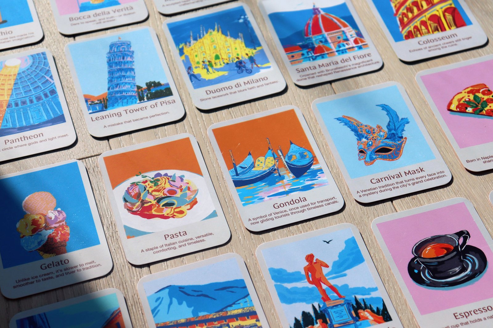 Guess Italia! is a card game inspired by iconic Italian architecture and culture. The project explores how our memories of objects or places can shift when described differently by others. The idea came from my exchange experience in Italy — during my travels, I realized that even when people visit the same site, their impressions can vary widely. Each description, shaped by personal perspective, language, and imagery, transforms the original memory into something new — a kind of simulacrum.