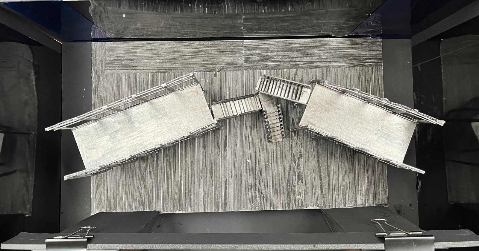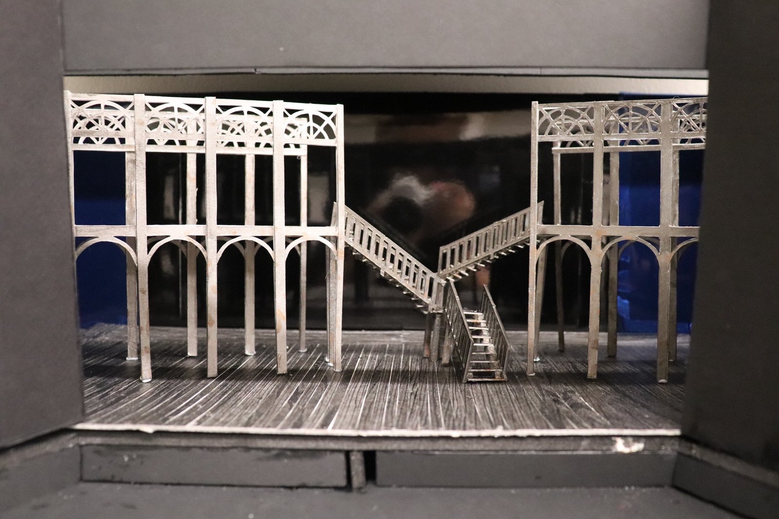The main structure is composed of iron - framed, hollow platforms, symbolizing both stability and fragility. The framework suggests a boundary between worlds — solid yet transparent, echoing the thin line that separates life and death. The slightly reflective backdrop softens the rigidity of metal, creating an illusive sense of depth and distance.