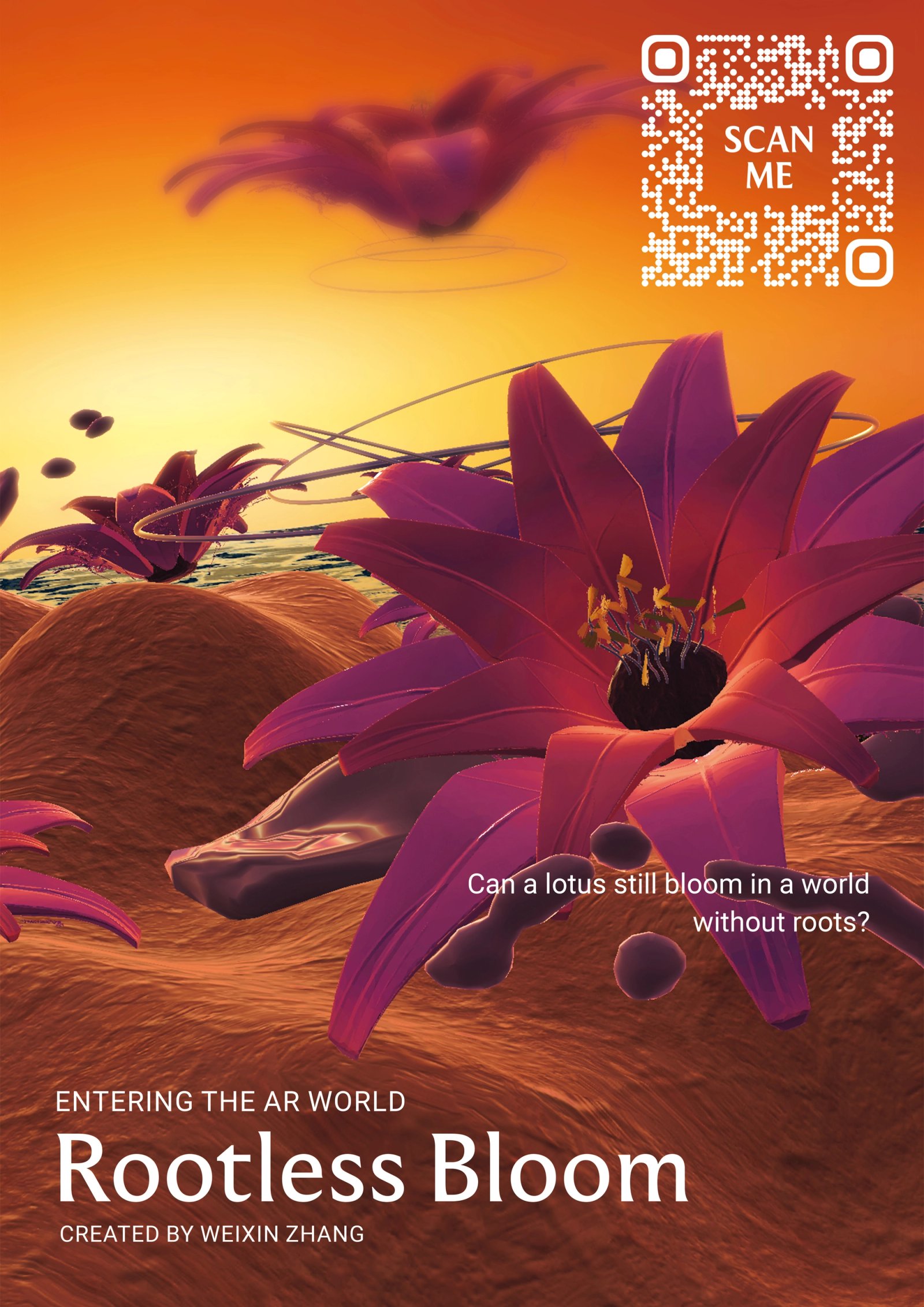 I am currently studying graphic design at the University of Melbourne. My creative practice covers visual design, interactive media and installation art. "Rootless Bloom" is my first work created using AR as the medium. It is a virtual desert where mechanical lotus flowers slowly breathe in digital light, symbolizing an attempt by humans to rebuild faith in illusions. It is not a prediction of the future, but rather a look back, a look back at the emotions, spirituality and connections that we still yearn for in the technological world. My study at VCA gradually led me to develop a creative approach that combines critical thinking with experimentation. I believe that design is not merely construction, but rather a process of re-perception. It allows us to pause in the accelerated pace of time, to listen, to gaze, and to once again touch upon the realities that are vanishing.