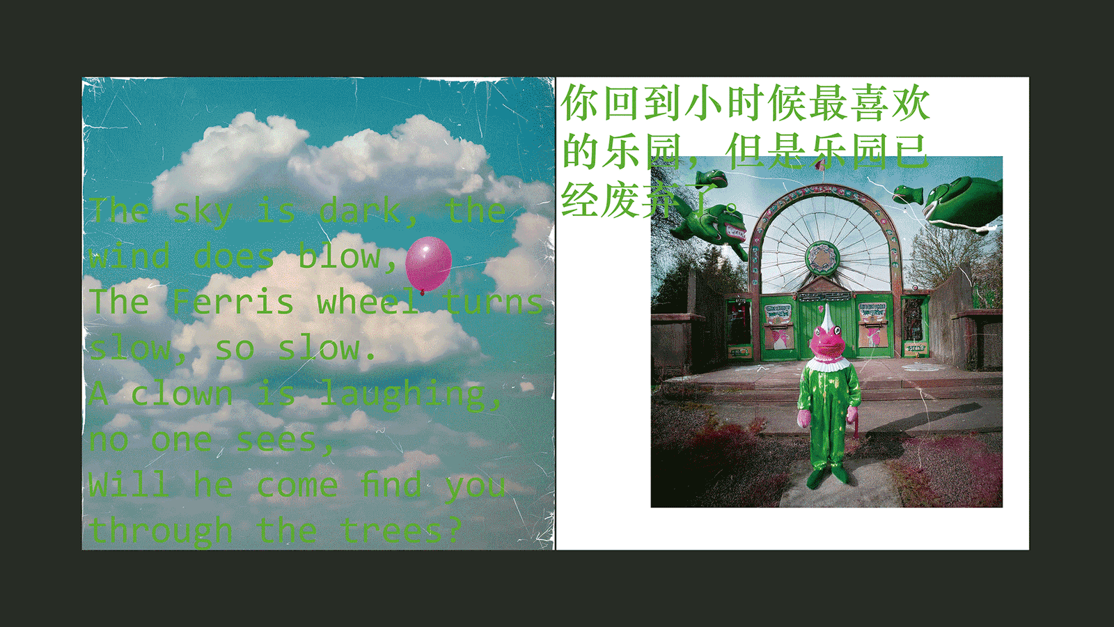 This project explores the creative possibilities of artificial intelligence through the use of Conversational AI (ChatGPT) and Generative Image AI (Adobe Firefly). I combined text prompts from ChatGPT with images produced in Adobe Firefly and collaged them together with AI-generated lyrics. The resulting zine portrays a bizarre, dreamlike amusement park drawn from childhood memories, blending surreal imagery with a cult-like, dream-core aesthetic. The work reflects my curiosity about how AI can extend human imagination and generate new forms of narrative and visual expression.