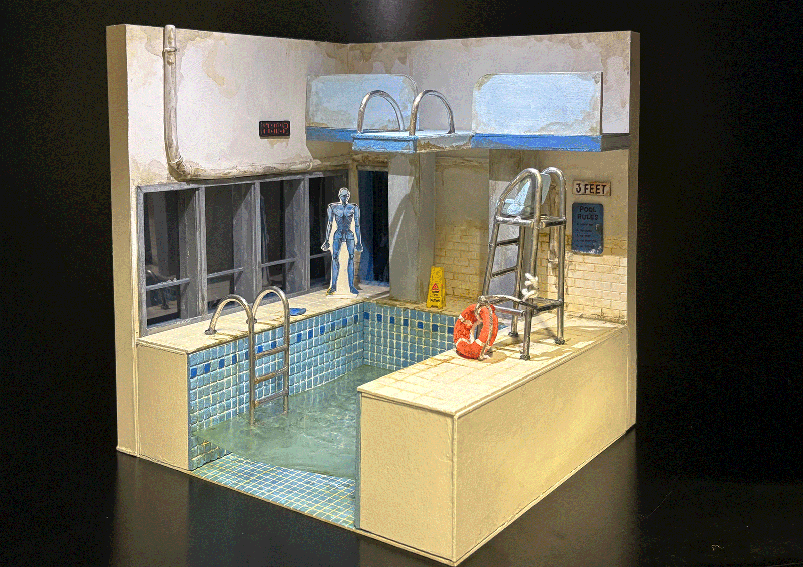 This work depicts a derelict swimming pool. It tells the story of a post-human future where a lone robot discovers this abandoned space and attempts a leap from the high diving platform, seeking the sensation of floating in water.This piece reflects my broader practice of using tactile, miniature constructions to evoke immersive narratives and emotional resonance.