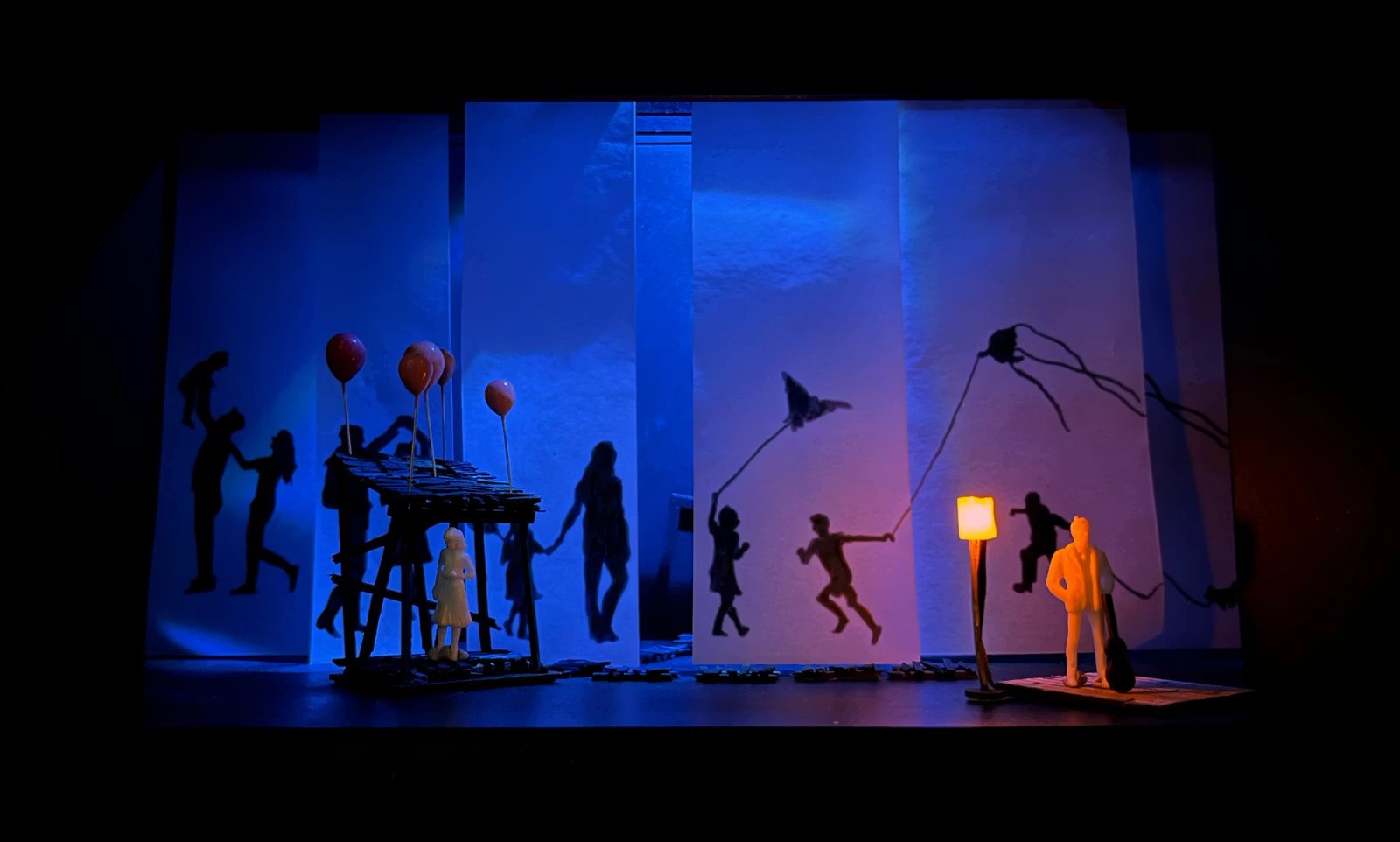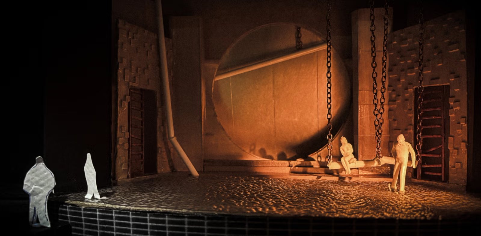 This design really catches the light, and the elevated platform adds a sense of drama. It steps away from naturalism. Like Yichen’s Eurydice, there’s an intriguing spatial division onstage. The movement of the pendant light captures so much transformation, shifting the space from the underworld to the overworld.